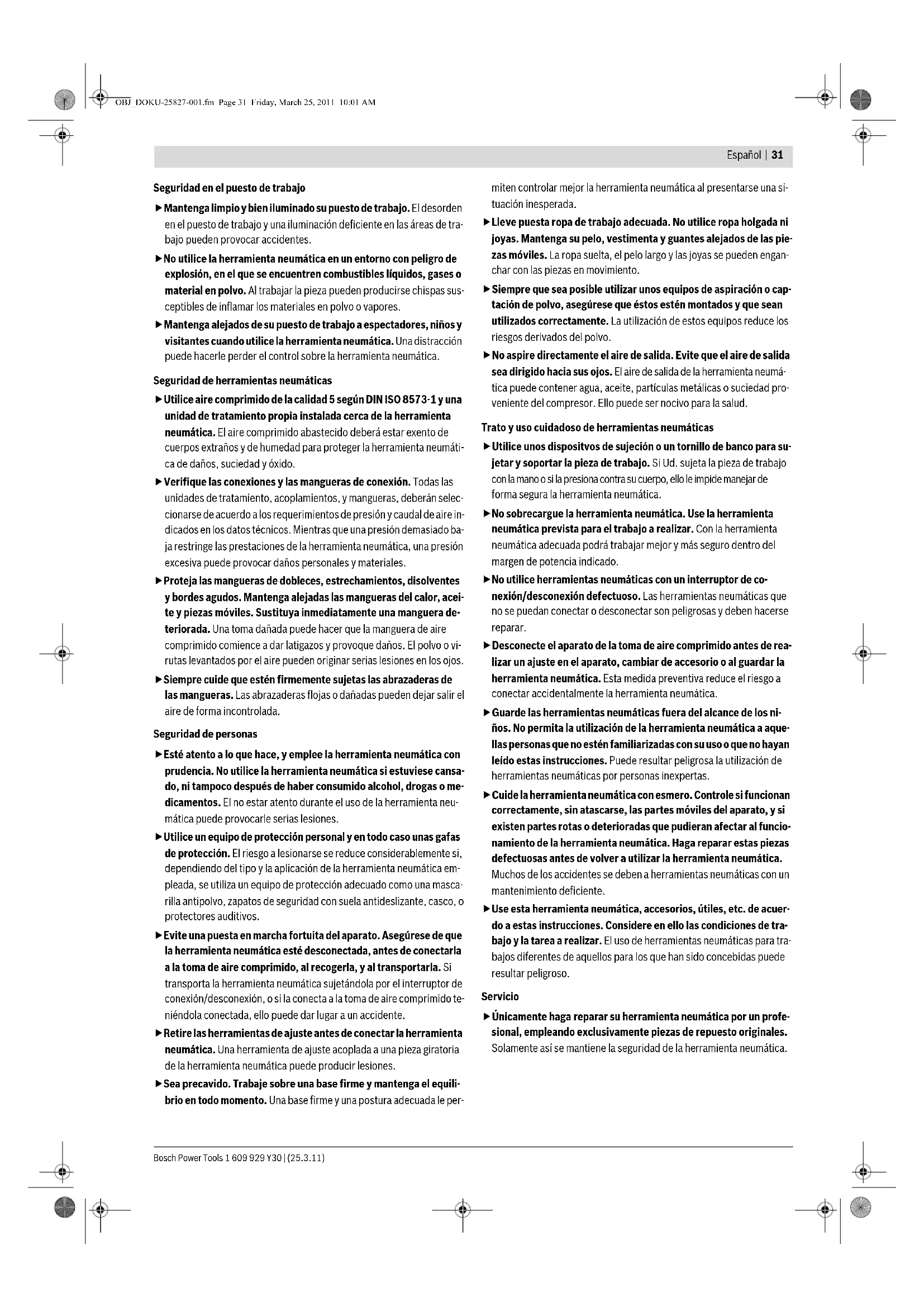 Dr. Egbert Schneider Senior Vice President Engineering Dr. Eckerhard Strötgen Head of Product Certification OBJ_DOKU-25827-001.fm Page 33 Friday, March 25, 2011 10:01 AM1 609 929 Y30 | (25.3.11) Bosch Power Tools 34 | Español En caso de duda, mida la presión en la entrada de aire con un manómetro teniendo conectada la herramienta neumática. Para poder obtener la potencia máxima es necesario respetar los paráme- tros fijados para la manguera de toma de aire 13 (rosca de conexión, pre- sión de servicio máxima, diámetro interior y longitud máxima de la man- guera; ver “Datos técnicos”). El aire comprimido abastecido deberá estar exento de cuerpos extraños y humedad para proteger la herramienta neumática de daños, suciedad y del óxido. Todos los accesorios, tuberías, y mangueras de conexión, deberán selec- cionarse de acuerdo a la presión y al caudal de aire requeridos. ¡Evite el estrechamiento de la manguera de alimentación, p.ej., debido a un aplastamiento, doblado o tracción! Conexión de la alimentación de aire a la herramienta neumática – Vacíe el cargador 8. (ver “Vaciado del cargador”, página 35) En los siguientes pasos de trabajo puede llegar a dispararse un elemen- to de sujeción si tras trabajos de reparación, mantenimiento o en el transporte, las piezas interiores de la herramienta neumática no se en- contrasen en la posición de partida. – Conecte la boquilla de conexión de aire 6 a una manguera de toma de aire 13 dotada con un enchufe de conexión rápida 12. – Verifique el perfecto funcionamiento presionando directamente la bo- ca 11 de la herramienta neumática, o bien, el protector de la pieza 1 re- cubierto de goma contra un trozo o base de madera, y dispare una o dos veces. Llenado del cargador (ver figuras B1–B2) Desconecte el aparato de la toma de aire comprimido antes de realizar un ajuste en el aparato, cambiar de ac- cesorio, o al guardar la herramienta neumática. Esta medida preventiva reduce el riesgo a conectar accidental- mente la herramienta neumática. fSolamente utilice accesorios originales Bosch (ver “Datos técni- cos”). Las piezas de precisión de la herramienta neumática, como el cargador, la boca y el canal de expulsión han sido especialmente con- cebidas para trabajar con grapas, clavos y puntas Bosch. Otros fabri- cantes emplean acero de una calidad y dimensiones diferentes. El uso de elementos de sujeción inapropiados puede perjudicar a la he- rramienta neumática y acarrear lesiones. Al llenar el cargador mantenga la herramienta neumática de manera que la boca 11 de la misma no quede dirigida contra su propio cuerpo ni con- tra otras personas. – Tire hacia atrás de la corredera de empuje 7 hasta enclavarla. Observación: La corredera de empuje deberá poder desplazarse hacia atrás sin gran esfuerzo (tan sólo con la propia fuerza de los dedos). Si la corredera de empuje desliza con dificultad los clavos disparados pene- tran en un ángulo incorrecto. – Limpie y lubrique la corredera de empuje 7 y asegúrese de que esté lim- pio el cargador 8. – Coloque una tira de clavos 14 apropiada. No emplee tiras que contengan menos de 5 clavos. No introduzca más de 2 tiras de clavos. Preste atención a que las cabezas de los clavos no se solapen. GSN 90-34 DK: En esta herramienta neumática, el bloqueo que incorpo- ra la corredera de empuje evita que sean disparados los últimos clavos. En el cargador permanecen 7 clavos, aprox. – Vuelva a tirar hacia atrás de la corredera de empuje 7 para desenclavar- la. – Guíe cuidadosamente hacia delante la corredera de empuje hasta que ésta llegue a tocar contra la tira de clavos. Al realizar esto asegúrese de que la corredera de empuje quede por en- cima de la cabeza del último clavo. Observación: No deje que la corredera de empuje recupere bruscamente por sí sola la posición inicial. En ese caso podría dañarse la corredera de empuje, además de existir el riesgo de que se pille los dedos con ella. Operación Sistemas de activación La herramienta neumática puede funcionar con dos sistemas de activa- ción diferentes: – Activación individual protegida Este sistema de activación requiere aplicar primero el seguro 2 contra la pieza de trabajo. El elemento de sujeción solamente es expulsado al accionarse el disparador 10. A continuación, la herramienta neumática solamente puede volver a ac- tivarse si el disparador y el seguro se encuentran nuevamente en la po- sición de partida. – Activación por contacto Este sistema de activación exige que primeramente sea presionado el disparador 10. El elemento de sujeción es disparado siempre que, te- niendo apretado el disparador, el seguro 2 sea presionado firmemente contra la pieza de trabajo. De esta manera la velocidad de trabajo es mayor. El selector 9 permite ajustar el sistema de activación deseado. Puesta en marcha Desconecte el aparato de la toma de aire comprimido antes de realizar un ajuste en el aparato, cambiar de ac- cesorio, o al guardar la herramienta neumática. Esta medida preventiva reduce el riesgo a conectar accidental- mente la herramienta neumática. Operación con activación individual (ver figura C) – Empuje hacia dentro el selector 9 al tiempo que lo inclina hacia la posi- ción inferior hasta volver a enclavarlo. Queda ajustado así el sistema de “Activación in- dividual”. – Suelte el selector 9. – Presione firmemente la boca 11, o bien, el protector de la pieza 1 re- vestido de goma contra la pieza de trabajo hasta empujar completa- mente hacia dentro el seguro 2. – Seguidamente, accione brevemente el disparador 10 y suéltelo a con- tinuación. Entonces se dispara un clavo. – Deje que la herramienta neumática rebote contra la pieza de trabajo. – Para continuar disparando, separe completamente la herramienta neu- mática de la pieza de trabajo y asiéntela firmemente de nuevo sobre el siguiente punto deseado. Operación con activación por contact