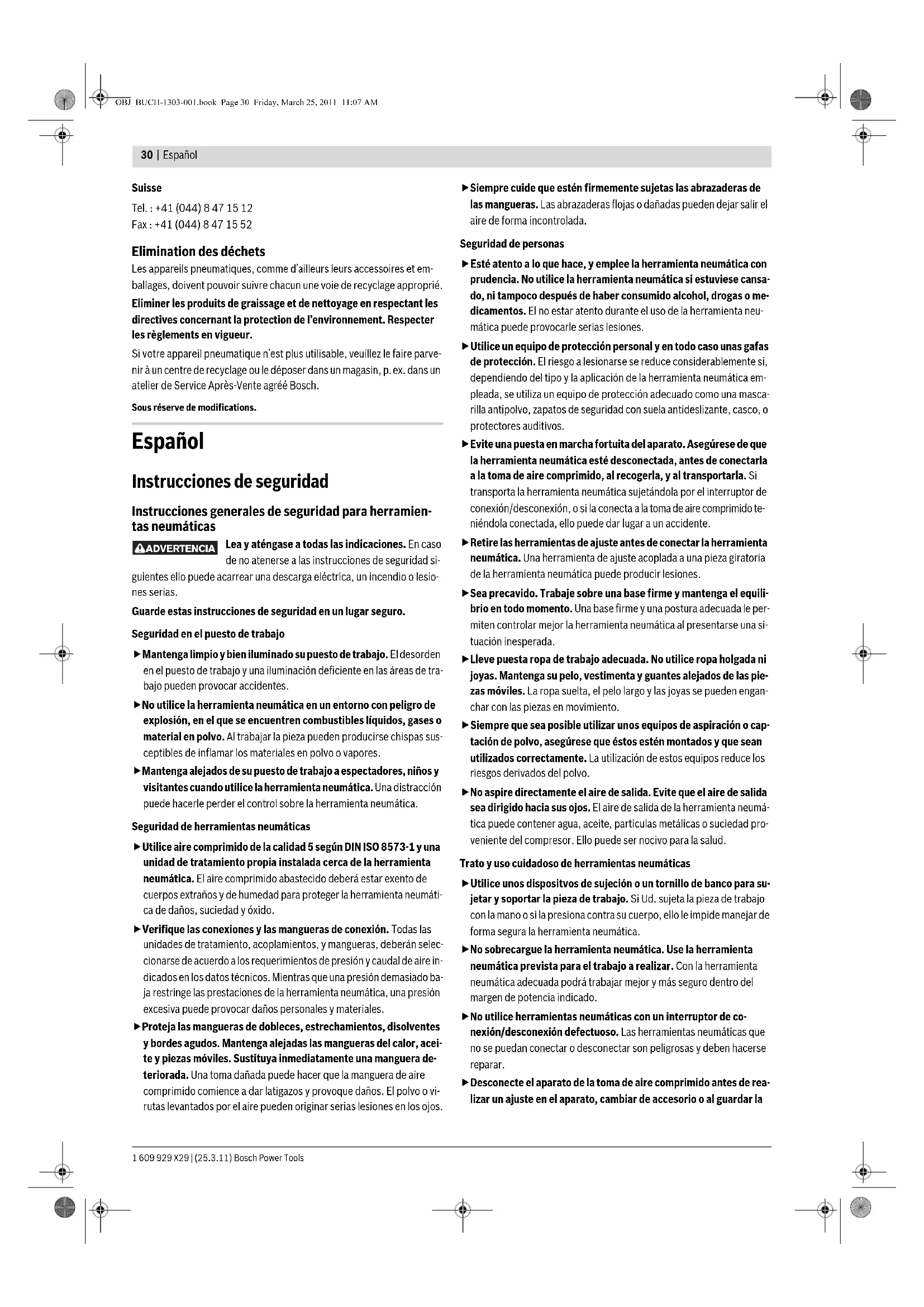 Peso según EPTA-Procedure 01/2003 kg 2,5 Dr. Egbert Schneider Senior Vice President Engineering Dr. Eckerhard Strötgen Head of Product Certification OBJ_BUCH-1303-001.book Page 32 Friday, March 25, 2011 11:07 AMEspañol | 33 Bosch Power Tools 1 609 929 X29 | (25.3.11) Cambio del disparador (ver figuras B1–B2) Desconecte el aparato de la toma de aire comprimido antes de realizar un ajuste en el aparato, cambiar de ac- cesorio, o al guardar la herramienta neumática. Esta medida preventiva reduce el riesgo a conectar accidental- mente la herramienta neumática. La herramienta neumática puede funcionar con dos sistemas de activa- ción diferentes. El sistema de activación lo selecciona montando el respectivo disparador. Desmontaje del disparador – Desprenda el anillo de goma 14 del pasador de seguridad 15. – Saque el pasador de seguridad 15 de la carcasa. – Tire oblicuamente hacia atrás y hacia abajo del disparador para sacarlo de la carcasa. Montaje del disparador – Seleccione el disparador adecuado al sistema de activación deseado. Observación: Al montar el disparador gris 5 preste atención a que la pa- lanca del disparador 16 se encuentre en la posición correcta (ver figura B2). – Introduzca el disparador en la carcasa. Al realizar esto asegúrese de que el resorte del disparador 17 este alo- jado sobre el perno del disparador 18 y haga presión contra la palanca del disparador 16. – Haga coincidir los orificios de montaje del disparador con los de la car- casa e inserte el pasador de seguridad 15 por dichos orificios. – Aloje el anillo de goma 14 en la ranura del pasador de seguridad 15. Llenado del cargador (ver figuras C1–C3) Desconecte el aparato de la toma de aire comprimido antes de realizar un ajuste en el aparato, cambiar de ac- cesorio, o al guardar la herramienta neumática. Esta medida preventiva reduce el riesgo a conectar accidental- mente la herramienta neumática. fSolamente utilice accesorios originales Bosch (ver “Datos técni- cos”). Las piezas de precisión de la herramienta neumática, como el cargador, la boca y el canal de expulsión han sido especialmente con- cebidas para trabajar con grapas, clavos y puntas Bosch. Otros fabri- cantes emplean acero de una calidad y dimensiones diferentes. El uso de elementos de sujeción inapropiados puede perjudicar a la he- rramienta neumática y acarrear lesiones. Al llenar el cargador mantenga la herramienta neumática de manera que la boca 9 de la misma no quede dirigida contra su propio cuerpo ni contra otras personas. – Limpie y lubrique el canal de expulsión 21 y asegúrese de que esté lim- pio el cargador 6. – Presione el cierre del cargador 4 y abra la tapa del cargador 7. El eje del cargador 19 deberá ajustarse a la longitud de los clavos para que la tira se desenrolle fácilmente y los clavos accedan a la parte delantera de la boca. – Tire hacia arriba del eje del cargador 19 y gírelo hasta enclavarlo en la posición deseada. – Aloje el rollo de clavos 20 en el eje del cargador 19. – Desenrolle un tramo de rollo suficiente de manera que el primer clavo pueda alojarse en el canal de expulsión 21 y el segundo en el alimenta- dor 22. Aloje las cabezas de los clavos en la ranura guía 23. – Cierre la tapa del cargador 7 de forma que enclave el cierre del carga- dor 4. fCuide que al montar el rollo de clavos no se dañe o deforme el alam- bre que sujeta los clavos. Si el alambre está dañado o si el rollo de ca- bles ha sido incorrectamente montado puede ocurrir que no pueda ce- rrarse bien la tapa del cargador. Ello puede provocar un funcionamiento deficiente de la herramienta neumática. Operación Sistemas de activación La herramienta neumática puede funcionar con dos sistemas de activa- ción diferentes: – Activación individual protegida Este sistema de activación requiere aplicar primero el seguro 10 contra la pieza de trabajo. El elemento de sujeción solamente es expulsado al accionarse el disparador . A continuación, la herramienta neumática solamente puede volver a ac- tivarse si el disparador y el seguro se encuentran nuevamente en la po- sición de partida. – Activación por contacto Este sistema de activación exige que primeramente sea presionado el disparador . El elemento de sujeción es disparado siempre que, tenien- do apretado el disparador, el seguro 10 sea presionado firmemente contra la pieza de trabajo. De esta manera la velocidad de trabajo es mayor. El sistema de activación lo selecciona montando el respectivo disparador. (ver “Cambio del disparador”, página 33) Puesta en marcha Desconecte el aparato de la toma de aire comprimido antes de realizar un ajuste en el aparato, cambiar de ac- cesorio, o al guardar la herramienta neumática. Esta medida preventiva reduce el riesgo a conectar accidental- mente la herramienta neumática. Operación con activación individual (ver figura D) – Monte el disparador gris 5. (ver “Cambio del disparador”, página 33) – Oprima firmemente la boca 9 contra la pieza de trabajo hasta compri- mir completamente el seguro 10. – Seguidamente, accione brevemente el disparador 5 y suéltelo a conti- nuación. Entonces se dispara un clavo. – Deje que la herramienta neumática rebote contra la pieza de trabajo. – Para continuar disparando, separe completamente la herramienta neu- mática de la pieza de trabajo y asiéntela firmemente de nuevo sobre el siguiente punto deseado. Simbología Disparador Sistema de activación Disparador 5 (gris) Activación individual protegida Disparador 8 (rojo) Activación por contacto Longitud de los clavos 19 mm–32 mm 32 mm–44 mm Inscripción del cargador 3/4–11/4 11/4–13/4 Posición del eje del car- gador arriba abajo Sentido de giro en el sentido de las agujas del reloj en sentido contrario a las agujas del reloj OBJ_BUCH-1303-001.book Page 33 Friday, March 25, 2011 11:07 AM1 609 929 X29 | (25.3.11) Bosch Power Tools 34 | Español Operación con activación 