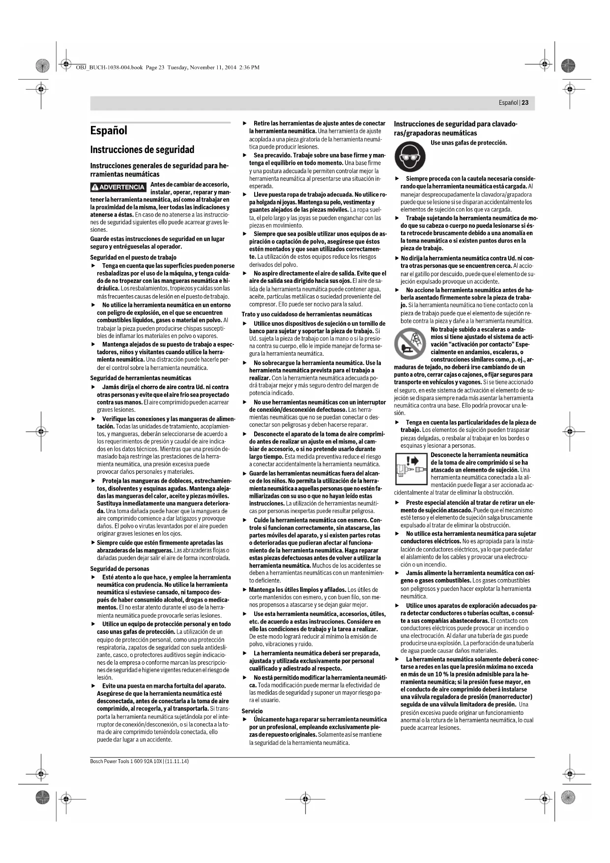 Guarde las herramientas neumáticas fuera del alcan- ce de los niños. No permita la utilización de la herra- mienta neumática a aquellas personas que no estén fa- miliarizadas con su uso o que no hayan leído estas instrucciones. La utilización de herramientas neumáti- cas por personas inexpertas puede resultar peligrosa. Cuide la herramienta neumática con esmero. Con- trole si funcionan correctamente, sin atascarse, las partes móviles del aparato, y si existen partes rotas o deterioradas que pudieran afectar al funciona- miento de la herramienta neumática. Haga reparar estas piezas defectuosas antes de volver a utilizar la herramienta neumática. Muchos de los accidentes se deben a herramientas neumáticas con un mantenimien- to deficiente. Mantenga los útiles limpios y afilados. Los útiles de corte mantenidos con esmero, y con buen filo, son me- nos propensos a atascarse y se dejan guiar mejor. Use esta herramienta neumática, accesorios, útiles, etc. de acuerdo a estas instrucciones. Considere en ello las condiciones de trabajo y la tarea a realizar. De este modo logrará reducir al mínimo la emisión de polvo, vibraciones y ruido. La herramienta neumática deberá ser preparada, ajustada y utilizada exclusivamente por personal cualificado y adiestrado al respecto. No está permitido modificar la herramienta neumáti- ca. Toda modificación puede mermar la efectividad de las medidas de seguridad y suponer un mayor riesgo pa- ra el usuario. Servicio Únicamente haga reparar su herramienta neumática por un profesional, empleando exclusivamente pie- zas de repuesto originales. Solamente así se mantiene la seguridad de la herramienta neumática. Instrucciones de seguridad para clavado- ras/grapadoras neumáticas Use unas gafas de protección. Siempre proceda con la cautela necesaria conside- rando que la herramienta neumática está cargada. Al manejar despreocupadamente la clavadora/grapadora puede que se lesione si se disparan accidentalmente los elementos de sujeción con los que va cargada. Trabaje sujetando la herramienta neumática de mo- do que su cabeza o cuerpo no pueda lesionarse si és- ta retrocede bruscamente debido a una anomalía en la toma neumática o si existen puntos duros en la pieza de trabajo. No dirija la herramienta neumática contra Ud. ni con- tra otras personas que se encuentren cerca. Al accio- nar el gatillo por descuido, puede que el elemento de su- jeción expulsado provoque un accidente. No accione la herramienta neumática antes de ha- berla asentado firmemente sobre la pieza de traba- jo. Si la herramienta neumática no tiene contacto con la pieza de trabajo puede que el elemento de sujeción re- bote contra la pieza y dañe a la herramienta neumática. No trabaje subido a escaleras o anda- mios si tiene ajustado el sistema de acti- vación “activación por contacto” Espe- cialmente en andamios, escaleras, o construcciones similares como, p. ej., ar- maduras de tejado, no deberá irse cambiando de un punto a otro, cerrar cajas o cajones, o fijar seguros para transporte en vehículos y vagones. Si se tiene accionado el seguro, en este sistema de activación el elemento de su- jeción se dispara siempre nada más asentar la herramienta neumática contra una base. Ello podría provocar una le- sión. Tenga en cuenta las particularidades de la pieza de trabajo. Los elementos de sujeción pueden traspasar piezas delgadas, o resbalar al trabajar en los bordes o esquinas y lesionar a personas. Desconecte la herramienta neumática de la toma de aire comprimido si se ha atascado un elemento de sujeción. Una herramienta neumática conectada a la ali- mentación puede llegar a ser accionada ac- cidentalmente al tratar de eliminar la obstrucción. Preste especial atención al tratar de retirar un ele- mento de sujeción atascado. Puede que el mecanismo esté tenso y el elemento de sujeción salga bruscamente expulsado al tratar de eliminar la obstrucción. No utilice esta herramienta neumática para sujetar conductores eléctricos. No es apropiada para la insta- lación de conductores eléctricos, ya lo que puede dañar el aislamiento de los cables y provocar una electrocu- ción o un incendio. Jamás alimente la herramienta neumática con oxí- geno o gases combustibles. Los gases combustibles son peligrosos y pueden hacer explotar la herramienta neumática. Utilice unos aparatos de exploración adecuados pa- ra detectar conductores o tuberías ocultas, o consul- te a sus compañías abastecedoras. El contacto con conductores eléctricos puede provocar un incendio o una electrocución. Al dañar una tubería de gas puede producirse una explosión. La perforación de una tubería de agua puede causar daños materiales. La herramienta neumática solamente deberá conec- tarse a redes en las que la presión máxima no exceda en más de un 10 % la presión admisible para la he- rramienta neumática; si la presión fuese mayor, en el conducto de aire comprimido deberá instalarse una válvula reguladora de presión (manorreductor) seguida de una válvula limitadora de presión. Una presión excesiva puede originar un funcionamiento anormal o la rotura de la herramienta neumática, lo cual puede acarrear lesiones. ADVERTENCIA OBJ_BUCH-1038-004.book Page 23 Tuesday, November 11, 2014 2:36 PM1 609 92A 10X | (11.11.14) Bosch Power Tools 24 | Español Descripción y prestaciones del pro- ducto Lea íntegramente estas advertencias de peligro e instrucciones. En caso de no ate- nerse a las advertencias de peligro e ins- trucciones siguientes, ello puede ocasionar una descarga eléctrica, un incendio y/o le- sión grave. Utilización reglamentaria La herramienta neumática ha sido diseñada para realizar trabajos de ensamble en armazones de tejados, encofra- dos, clavado de tablas, fabricación de módulos de pared y techo, fachadas de madera, palets, cercas de madera, pa- redes insonorizadas y cajones. Únicamente deberán usarse los elementos de sujeción (