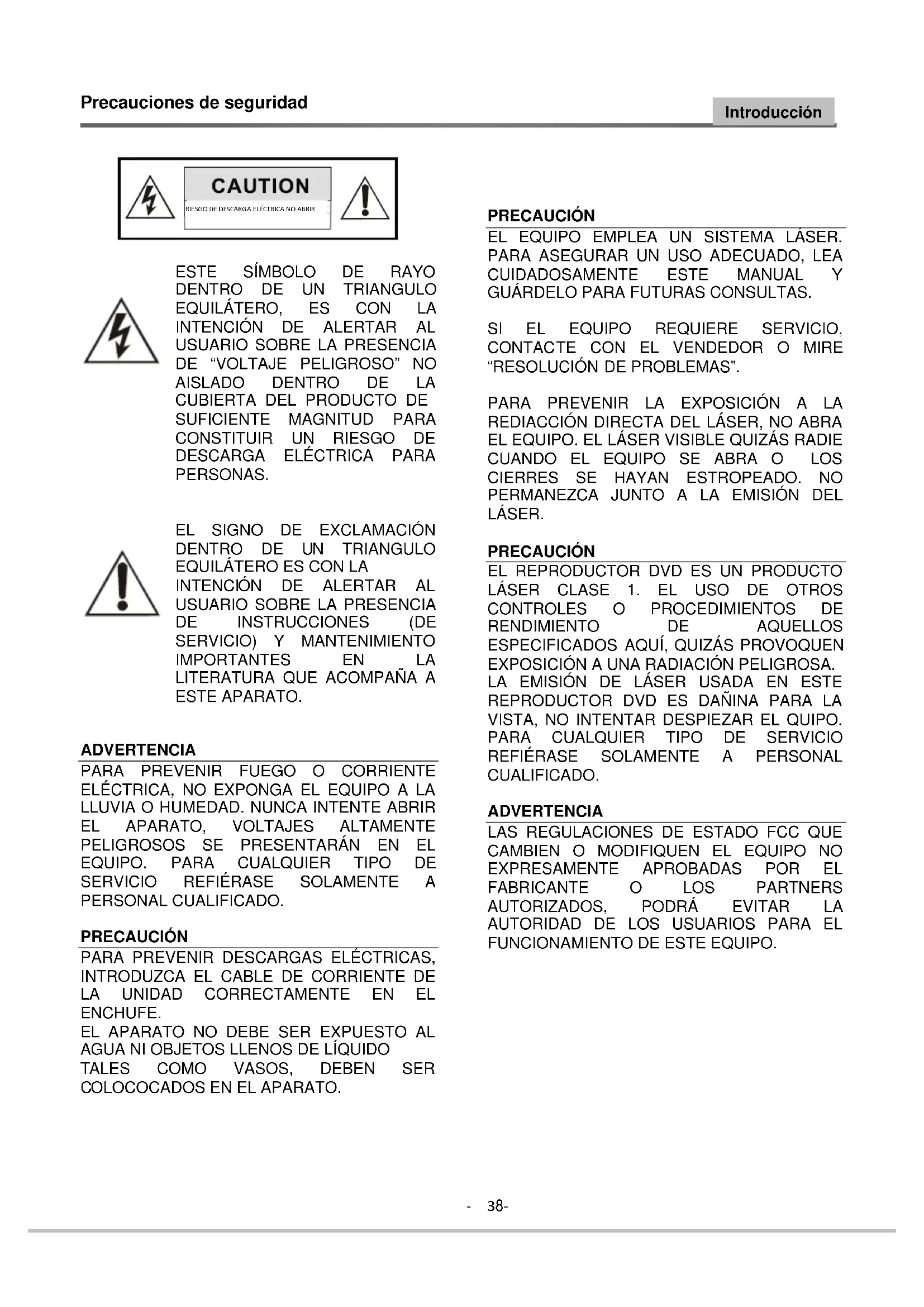 36Contenido Introducción Precauciones de seguridad………… ………………………………………………………………38-39 Instrucciones importantes de seguridad…………………………………………………………...40-41