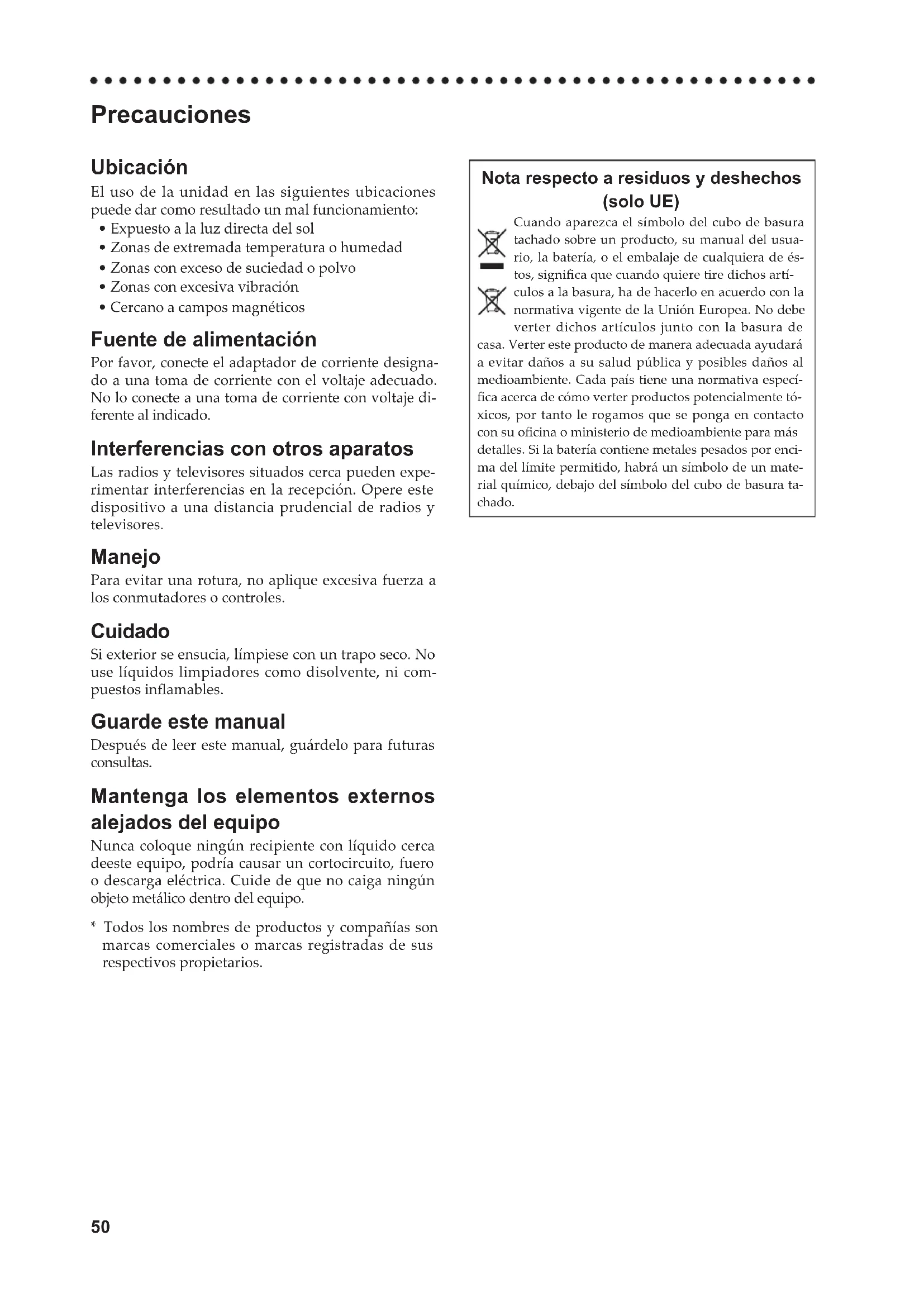 - Cercano a campos magnéticos Fuente de alimentación Por favor, conecte el adaptador de corriente designa- do a una toma de corriente con el voltaje adecuado. No lo conecte a una toma de corriente con voltaje di- ferente al indicado. Interferencias con otros aparatos Las radios y televisores situados cerca pueden expe- rimentar interferencias en la recepción. Opere este dispositivo a una distancia prudencial de radios y televisores. Manejo Para evitar una rotura, no aplique excesiva fuerza a los conmutadores o controles. Cuidado Si exterior se ensucia, límpiese con un trapo seco. No use líquidos limpiadores como disolvente, ni com- puestosinamables. Guarde este manual Después de leer este manual, guárdelo para futuras consultas. Mantenga los elementos externos alejados del equipo Nunca coloque ningún recipiente con líquido cerca deeste equipo, podría causar un cortocircuito, fuero o descarga eléctrica. Cuide de que no caiga ningún objeto metálico dentro del equipo.