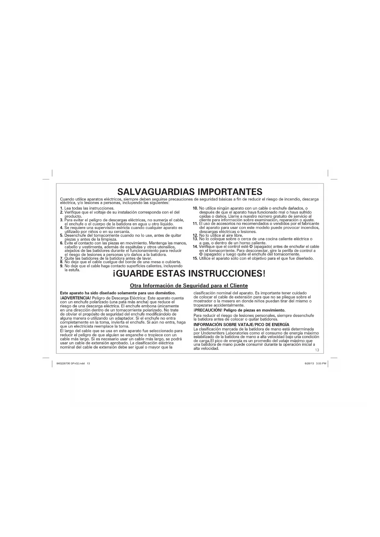 Cuando utilice aparatos eléctricos, siempre deben seguirse precauciones de seguridad básicas a fin de reducir el riesgo de incendio, descarga eléctrica, y/o lesiones a personas, incluyendo las siguientes: ¡GUARDE ESTAS INSTRUCCIONES! Otra Información de Seguridad para el Cliente Este aparato ha sido diseñado solamente para uso doméstico. ¡ADVERTENCIA! Peligro de Descarga Eléctrica: Este aparato cuenta con un enchufe polarizado (una pata más ancha) que reduce el riesgo de una descarga eléctrica. El enchufe embona únicamente en una dirección dentro de un tomacorriente polarizado. No trate de obviar el propósito de seguridad del enchufe modificándolo de alguna manera o utilizando un adaptador. Si el enchufe no entra completamente en la toma, invierta el enchufe. Si aún no entra, haga que un electricista reemplace la toma. El largo del cable que se usa en este aparato fue seleccionado para reducir el peligro de que alguien se enganche o tropiece con un cable más largo. Si es necesario usar un cable más largo, se podrá usar un cable de extensión aprobado. La clasificación eléctrica nominal del cable de extensión debe ser igual o mayor que la clasificación nominal del aparato. Es importante tener cuidado de colocar el cable de extensión para que no se pliegue sobre el mostrador o la mesera en donde niños puedan tirar del mismo o tropezarse accidentalmente. ¡PRECAUCIÓN! Peligro de piezas en movimiento. Para reducir el riesgo de lesiones personales, siempre desenchufe la batidora antes de colocar o quitar batidores. INFORMACIÓN SOBRE VATAJE/PICO DE ENERGÍA La clasificación marcada de la batidora de mano está determinada por Underwriters Laboratories como el consumo de energía máximo estabilizado de la batidora de mano a alta velocidad bajo una condición de carga.El pico de energía es un promedio del vataje máximo que una batidora de mano puede consumir durante la operación inicial a alta velocidad. 840228700 SPv02.indd 13840228700 SPv02.indd 13 6/26/13 3:55 PM6/26/13 3:55 PM14 Partes y Características Soporte de Tazón (Bowl Rest™) Gatillo Eyectar Botón BURST (explosión) Control de Velocidad La siguiente guía de mezclado es una sugerencia para seleccionar velocidades para batidoras de 6 velocidades. Comience en la velocidad 1 y suba hasta la velocidad deseada en base a la consistencia de la receta. Guía General de Mezclado