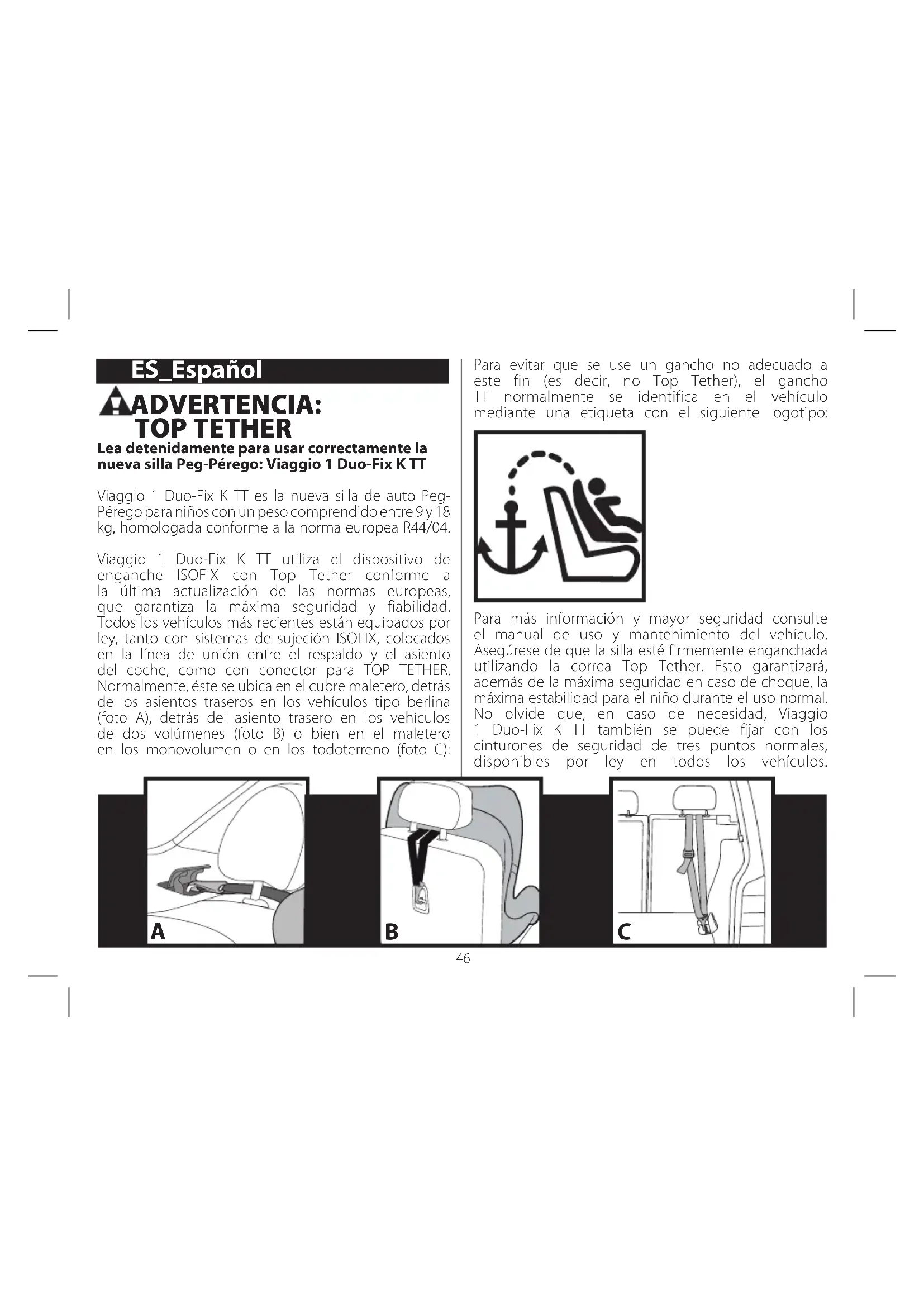 - Laufende Produktionsnummer: Kennzeichnet jeden einzelnen Autokindersitz. Nach der Zulassung ist jeder der Sitze an seiner Produktionsnummer erkennbar. PEG-PÉREGO S.p.A. Peg-Pérego S.p.A. ist gemäß ISO 9001 zertifiziert. Die Zertifizierung garantiert den Kunden und Verbrauchern Transparenz und ermöglicht das Vertrauen in die Arbeitsweise des Unternehmens. Peg Pérego kann zu jedem beliebigen Zeitpunkt Änderungen an den in dieser Veröffentlichung beschriebenen Modellen sowohl aus technischen, als auch aus kommerziellen Gründen vornehmen. Peg Pérego steht den Verbrauchern zur Verfügung, um deren Anforderungen auf das Bestmöglichste gerecht zu werden. Demnach ist es ausgesprochen wichtig und wertvoll für uns, über die Meinung unserer Kunden Bescheid zu wissen. Wir bitten Sie daher, das FORMULAR ÜBER DIE KONSUMENTENZUFRIEDENHEIT auszufüllen, nachdem Sie unsere Produkte ausprobiert haben. Das Formular ist unter folgender Internetadresse abrufbar: www.pegperego.com. Kundendienst Peg-Pérego Sollten Teile des Modells verloren gehen oder beschädigt werden, ersetzen Sie diese bitte ausschließlich durch Originalteile von Peg Perego. Für Reparaturen, Ersatzteile, Produktinformationen und Anbieter von originalen Ersatzteilen und Zubehör wenden Sie sich bitte an den Peg Perego Kundendienst. Halten Sie hierfür, wenn möglich, die Seriennummer des betreffenden Produktes bereit. Tel. 0039/039/60.88.213 Fax 0039/039/33.09.992 E-Mail assistenza@pegperego.it Webseite www.pegperego.com46 ES_Español Para evitar que se use un gancho no adecuado a este fin (es decir, no Top Tether), el gancho TT normalmente se identifica en el vehículo mediante una etiqueta con el siguiente logotipo: Para más información y mayor seguridad consulte el manual de uso y mantenimiento del vehículo. Asegúrese de que la silla esté firmemente enganchada utilizando la correa Top Tether. Esto garantizará, además de la máxima seguridad en caso de choque, la máxima estabilidad para el niño durante el uso normal. No olvide que, en caso de necesidad, Viaggio 1 Duo-Fix K TT también se puede fijar con los cinturones de seguridad de tres puntos normales, disponibles por ley en todos los vehículos. ADVERTENCIA: TOP TETHER Lea detenidamente para usar correctamente la nueva silla Peg-Pérego: Viaggio 1 Duo-Fix K TT Viaggio 1 Duo-Fix K TT es la nueva silla de auto Peg- Pérego para niños con un peso comprendido entre 9 y 18 kg, homologada conforme a la norma europea R44/04. Viaggio 1 Duo-Fix K TT utiliza el dispositivo de enganche ISOFIX con Top Tether conforme a la última actualización de las normas europeas, que garantiza la máxima seguridad y fiabilidad. Todos los vehículos más recientes están equipados por ley, tanto con sistemas de sujeción ISOFIX, colocados en la línea de unión entre el respaldo y el asiento del coche, como con conector para TOP TETHER. Normalmente, éste se ubica en el cubre maletero, detrás de los asientos traseros en los vehículos tipo berlina (foto A), detrás del asiento trasero en los vehículos de dos volúmenes (foto B) o bien en el maletero en los monovolumen o en los todoterreno (foto C): BA C47 Para evitar que se use un gancho no adecuado a este fin (es decir, no Top Tether), el gancho TT normalmente se identifica en el vehículo mediante una etiqueta con el siguiente logotipo: Para más información y mayor seguridad consulte el manual de uso y mantenimiento del vehículo. Asegúrese de que la silla esté firmemente enganchada utilizando la correa Top Tether. Esto garantizará, además de la máxima seguridad en caso de choque, la máxima estabilidad para el niño durante el uso normal. No olvide que, en caso de necesidad, Viaggio 1 Duo-Fix K TT también se puede fijar con los cinturones de seguridad de tres puntos normales, disponibles por ley en todos los vehículos. Le agradecemos haber elegido un producto Peg-Pérego. Características del producto Silla de auto, Grupo 1, categoría “Universal” con cinturones de seguridad.