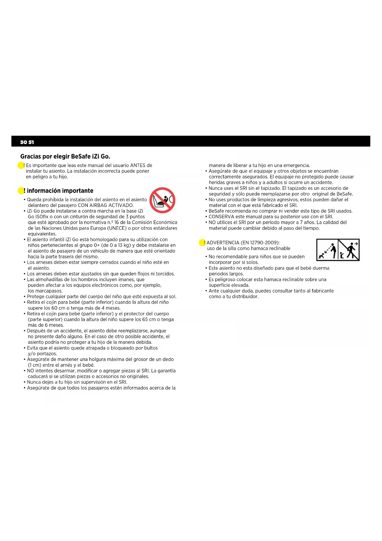- Asegúrate de que todos los pasajeros estén informados acerca de la Gracias por elegir BeSafe iZi Go. ! Es importante que leas este manual del usuario ANTES de instalar tu asiento. La instalación incorrecta puede poner en peligro a tu hijo. ! ADVERTENCIA (EN 12790-2009): uso de la silla como hamaca reclinable manera de liberar a tu hijo en una emergencia.