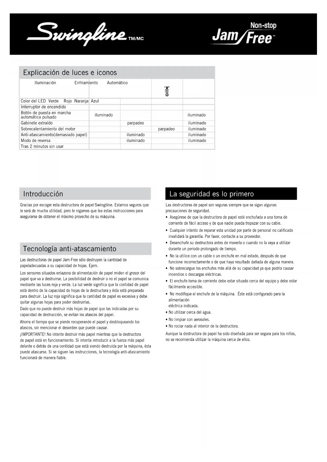 - No rociar nada al interior de la destructora. Aunque la destructora de papel ha sido diseñada para ser segura para los niños, no se recomienda utilizar la máquina cerca de ellos. Tecnología anti-atascamiento Las destructoras de papel Jam-Free sólo destruyen la cantidad de papeladecuadas a su capacidad de hojas. Ejem. Los sensores situados enlazona de alimentación de papel miden el grosor del papel que va a destruirse. La posibilidad de destruir o no el papel se comunica mediante las luces roja y verde. La luz verde significa que la contidad de papel está dentro de la capacidad de hojas de la destructora y ésta está preparada para destruir. La luz roja significa que la cantidad de papel es excesiva y debe quitar algunas hojas para poder destruirlas. Dado que no puede destruir más hojas de papel que las indicadas por su capacidad de destrucción, se evitan los atascos del papel. Ahorra el tiempo que se pierde recuperando el papel y desbloqueando los atascos, sin mencionar el desorden que puede causar. ¡IMPORTANTE! No intente destruir más papel mientras que la destructora de papel está en funcionamiento. Si intenta introducir a la fuerza más papel delante o detrás de una contidad que está siendo destruida por la máquina, ésta puede atascarse. Si se siguen las instrucciones, la tecnología anti-atascamiento funcionará de manera fiable. Introducción Gracias por escoger esta destructora de papel Swingline . Estamos seguros que le será de mucha utilidad, pero le rogamos que lea estas instrucciones para asegurarse de obtener el máximo provecho de su máquina. Explicación de luces e iconos Iluminación Enfriamiento Automático