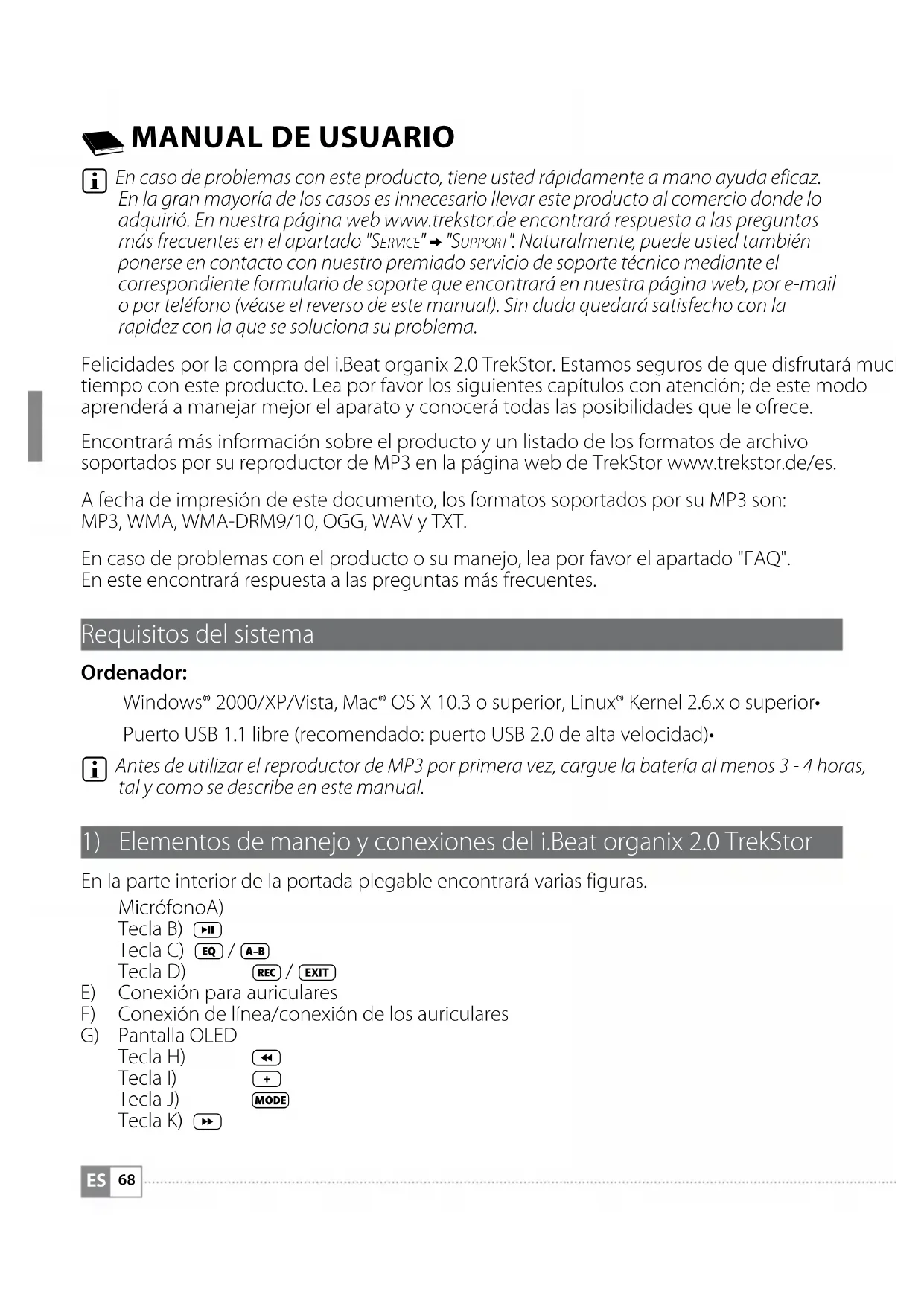En caso de problemas con este producto, tiene usted rápidamente a mano ayuda eficaz. En la gran mayoría de los casos es innecesario llevar este producto al comercio donde lo adquirió. En nuestra página web www.trekstor.de encontrará respuesta a las preguntas más frecuentes en el apartado "Se r v i c e " + "Su p p o r t ". Naturalmente, puede usted también ponerse en contacto con nuestro premiado servicio de soporte técnico mediante el correspondiente formulario de soporte que encontrará en nuestra página web, por e-mail o por teléfono (véase el reverso de este manual). Sin duda quedará satisfecho con la rapidez con la que se soluciona su problema. Felicidades por la compra del i.Beat organix 2.0 TrekStor. Estamos seguros de que disfrutará mucho tiempo con este producto. Lea por favor los siguientes capítulos con atención; de este modo aprenderá a manejar mejor el aparato y conocerá todas las posibilidades que le ofrece. Encontrará más información sobre el producto y un listado de los formatos de archivo soportados por su reproductor de MP3 en la página web de TrekStor www.trekstor.de/es. A fecha de impresión de este documento, los formatos soportados por su MP3 son: MP3, WMA, WMA-DRM9/10, OGG, WAV y TXT. En caso de problemas con el producto o su manejo, lea por favor el apartado "FAQ". En este encontrará respuesta a las preguntas más frecuentes. Requisitos del sistema Ordenador: Windows® 2000/XP/Vista, Mac® OS X 10.3 o superior, Linux® Kernel 2.6.x o superior• Puerto USB 1.1 libre (recomendado: puerto USB 2.0 de alta velocidad)•