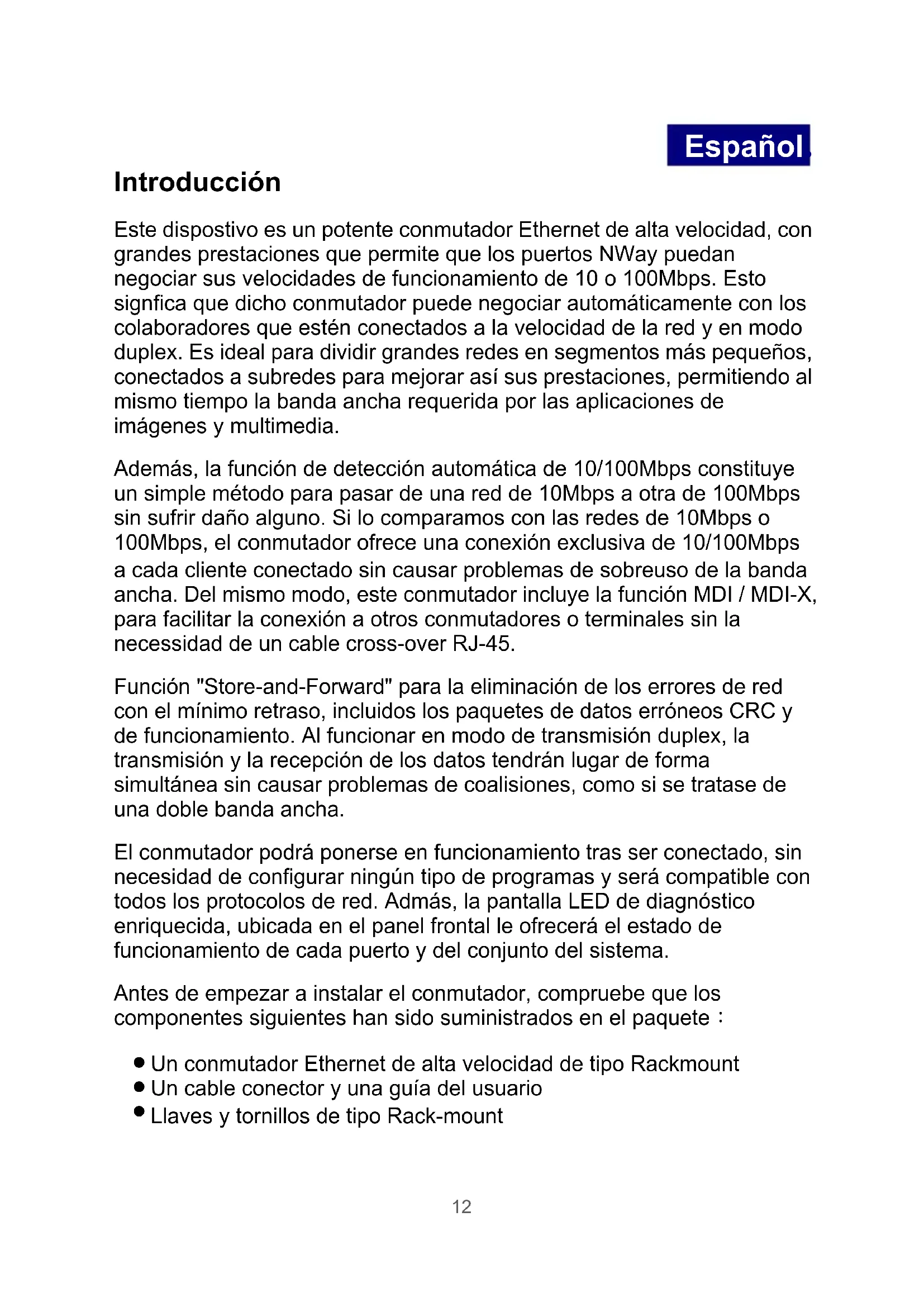11Español. Introducción Este dispostivo es un potente conmutador Ethernet de alta velocidad, con grandes prestaciones que permite que los puertos NWay puedan negociar sus velocidades de funcionamiento de 10 o 100Mbps. Esto signfica que dicho conmutador puede negociar automáticamente con los colaboradores que estén conectados a la velocidad de la red y en modo duplex. Es ideal para dividir grandes redes en segmentos más pequeños, conectados a subredes para mejorar así sus prestaciones, permitiendo al mismo tiempo la banda ancha requerida por las aplicaciones de imágenes y multimedia. Además, la función de detección automática de 10/100Mbps constituye un simple método para pasar de una red de 10Mbps a otra de 100Mbps sin sufrir daño alguno. Si lo comparamos con las redes de 10Mbps o 100Mbps, el conmutador ofrece una conexión exclusiva de 10/100Mbps a cada cliente conectado sin causar problemas de sobreuso de la banda ancha. Del mismo modo, este conmutador incluye la función MDI / MDI-X, para facilitar la conexión a otros conmutadores o terminales sin la necessidad de un cable cross-over RJ-45. Función "Store-and-Forward" para la eliminación de los errores de red con el mínimo retraso, incluidos los paquetes de datos erróneos CRC y de funcionamiento. Al funcionar en modo de transmisión duplex, la transmisión y la recepción de los datos tendrán lugar de forma simultánea sin causar problemas de coalisiones, como si se tratase de una doble banda ancha. El conmutador podrá ponerse en funcionamiento tras ser conectado, sin necesidad de configurar ningún tipo de programas y será compatible con todos los protocolos de red. Admás, la pantalla LED de diagnóstico enriquecida, ubicada en el panel frontal le ofrecerá el estado de funcionamiento de cada puerto y del conjunto del sistema. Antes de empezar a instalar el conmutador, compruebe que los componentes siguientes han sido suministrados en el paquete: Un conmutador Ethernet de alta velocidad de tipo Rackmount Un cable conector y una guía del usuario Llaves y tornillos de tipo Rack-mount