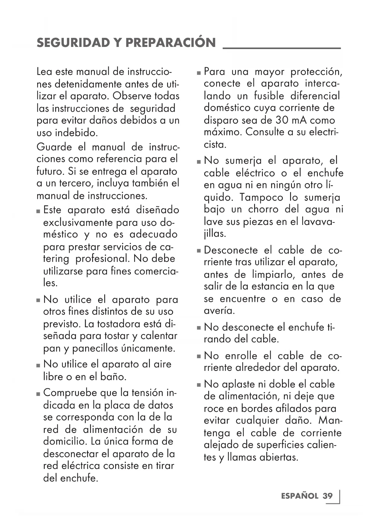 No utilice el aparato para otros fines distintos de su uso previsto. La tostadora está di- señada para tostar y calentar pan y panecillos únicamente.