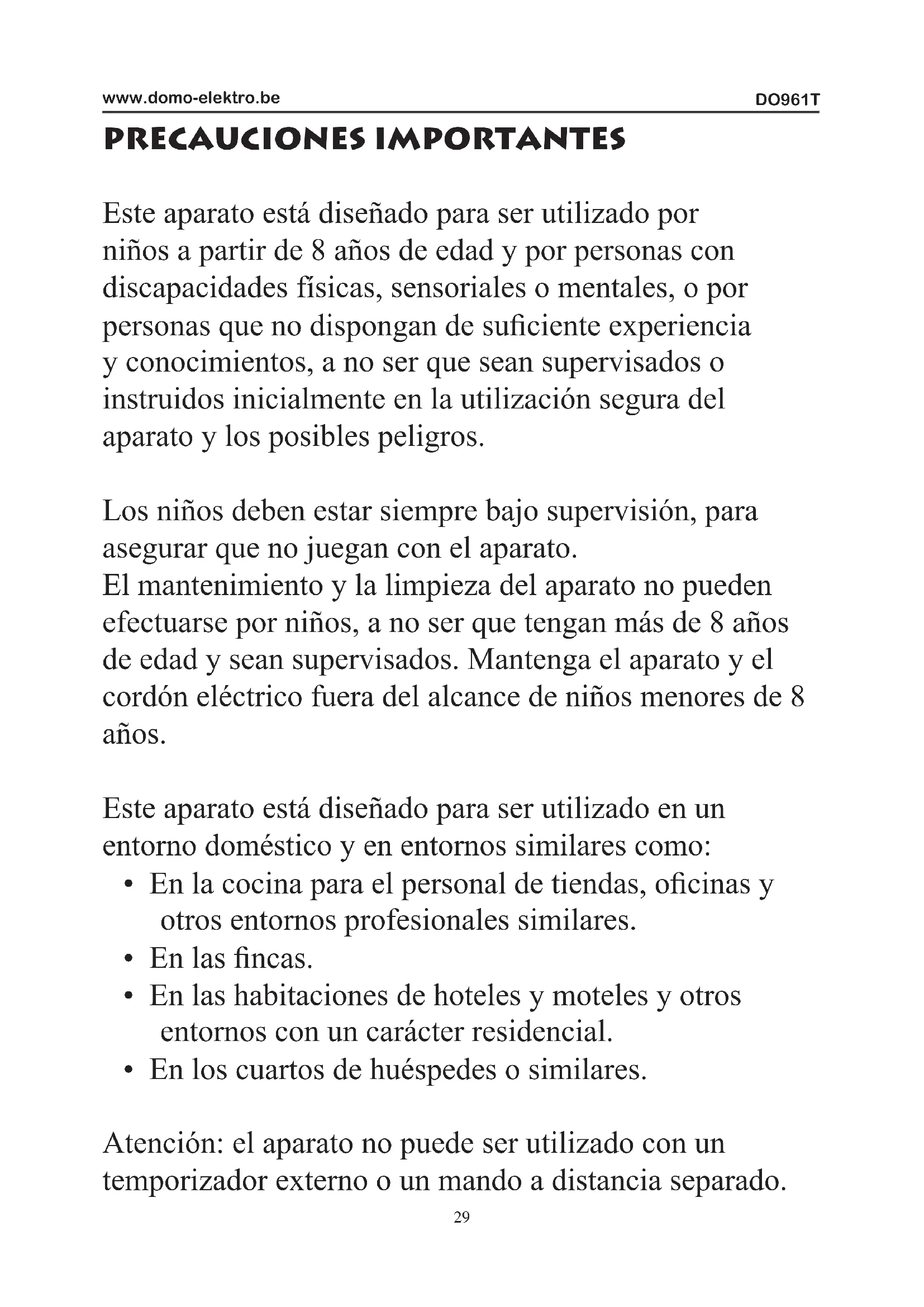 www.domo-elektro.be PRECAUCIONES IMPORTANTES Este aparato está diseñado para ser utilizado por niños a partir de 8 años de edad y por personas con discapacidades físicas, sensoriales o mentales, o por personas que no dispongan de suciente experiencia y conocimientos, a no ser que sean supervisados o instruidos inicialmente en la utilización segura del aparato y los posibles peligros. Los niños deben estar siempre bajo supervisión, para asegurar que no juegan con el aparato. El mantenimiento y la limpieza del aparato no pueden efectuarse por niños, a no ser que tengan más de 8 años de edad y sean supervisados. Mantenga el aparato y el cordón eléctrico fuera del alcance de niños menores de 8 años. Este aparato está diseñado para ser utilizado en un entorno doméstico y en entornos similares como: