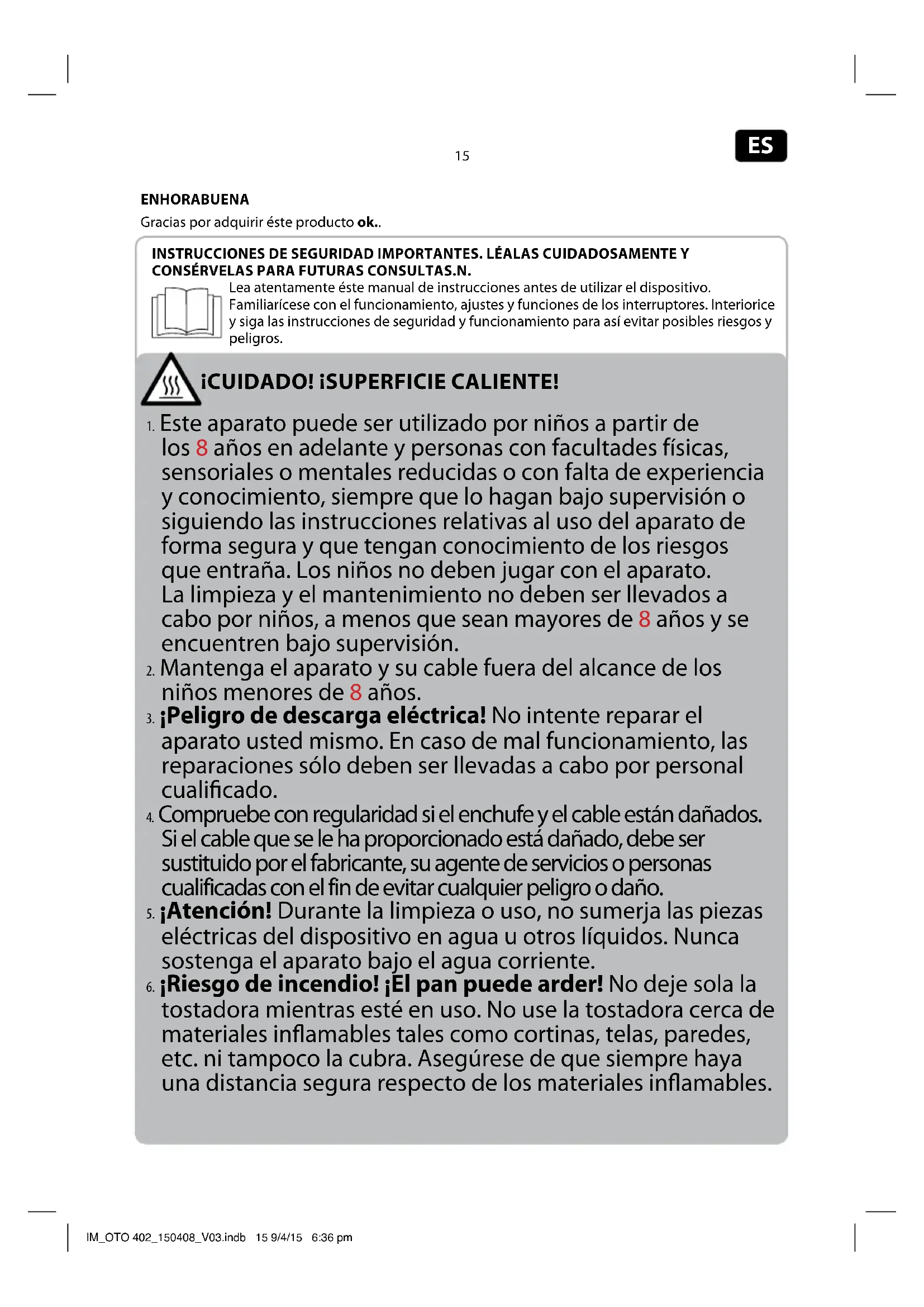 Riesgo de incendio! El pan puede arder! No deje sola la tostadora cuando está en uso. No use la tostadoraerca de materiales inflamables tales como cortinas, telas, paredes, etc. ni tampoco la cubra. Asegúrese de que siempre haya una distancia segura respecto de los materiales inflamables.