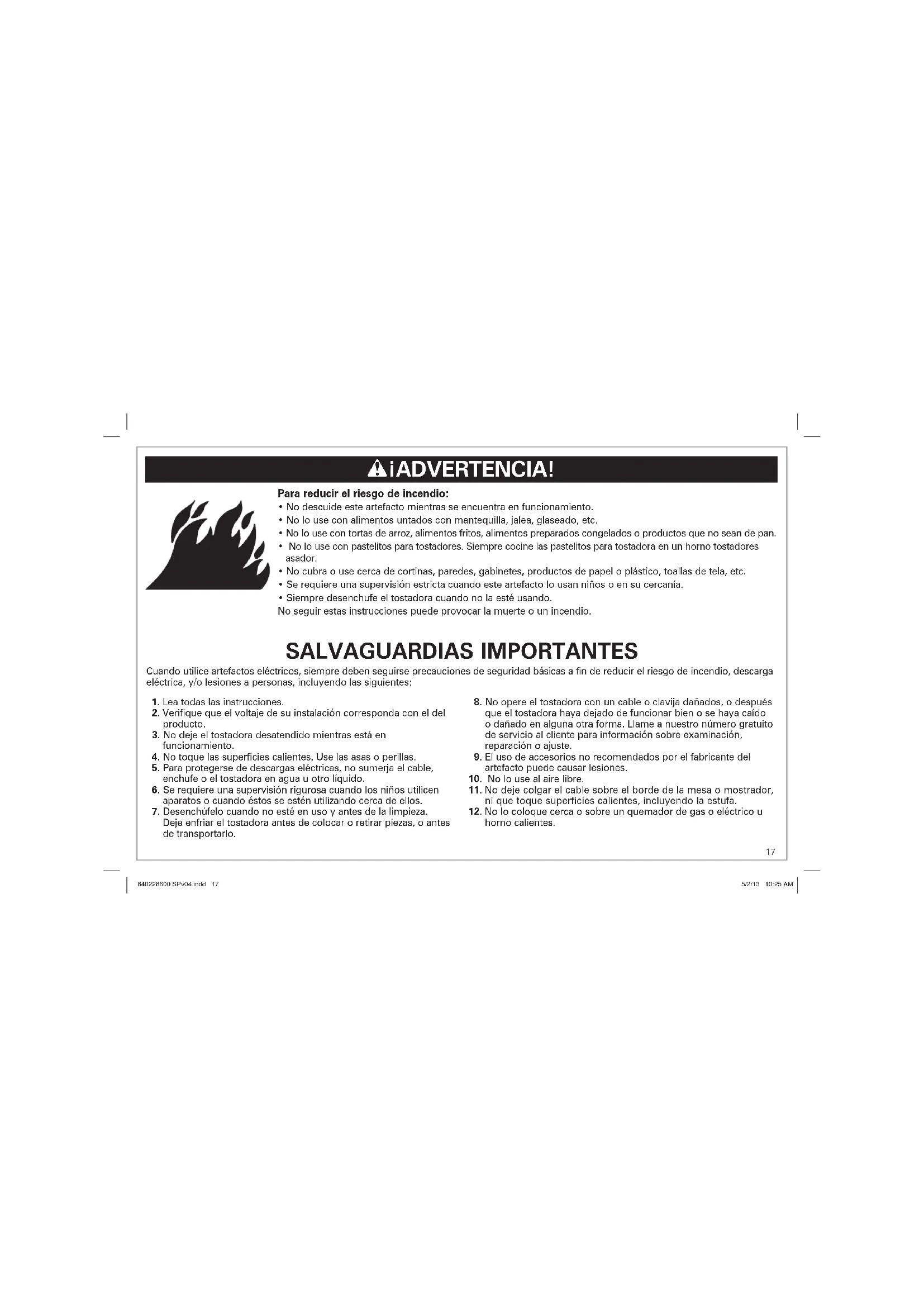 No opere el tostadora con un cable o clavija danados, oupones que el tostadora haya dejoado de funcionar bien o se haya caido o dañado en algoña other forma. Llamte a nuestro número Gratis to de service al cliente para información sobre examinacion, reparacion o ajuste.