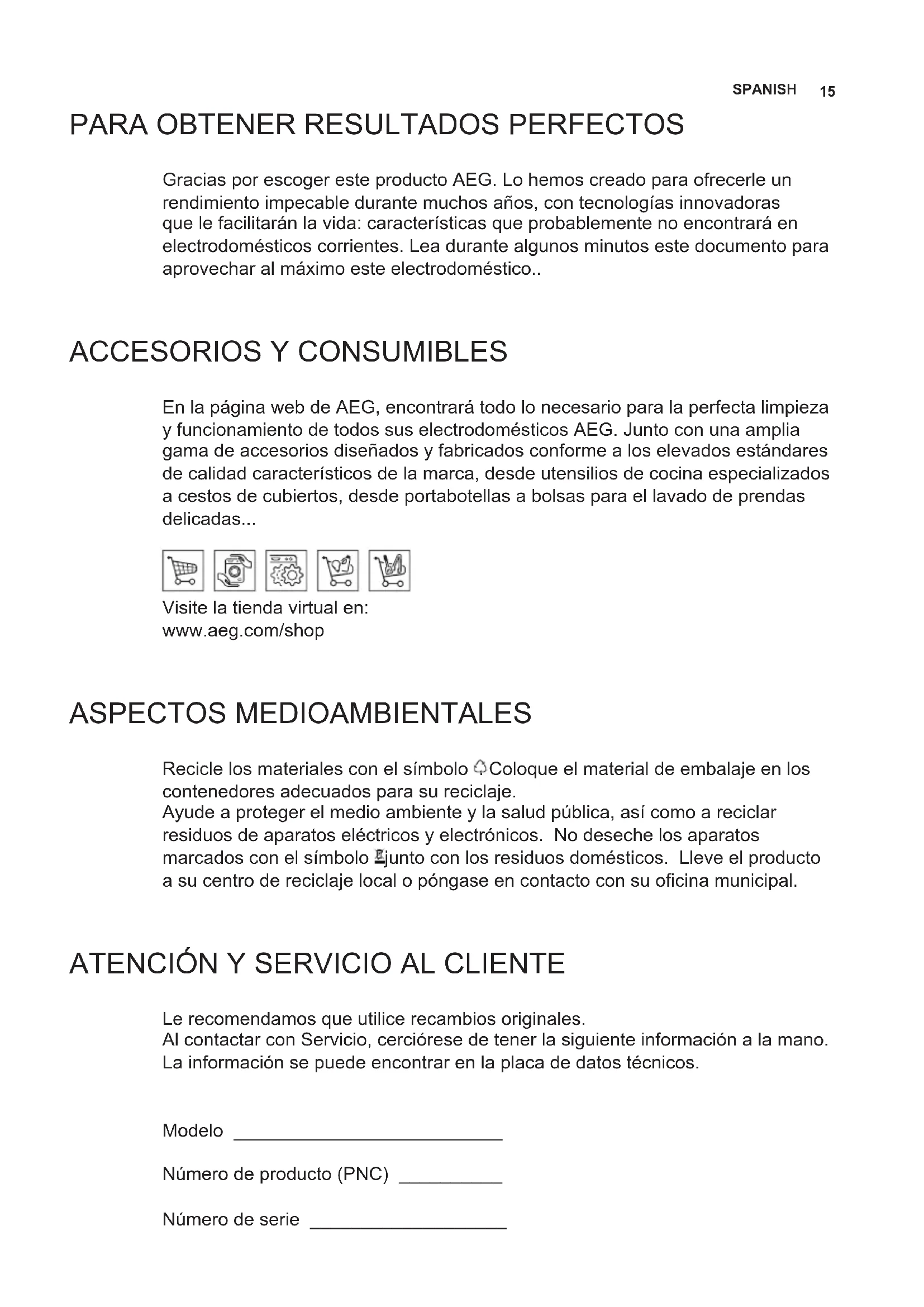 En la página web de AEG, encontrará todo lo necesario para la perfecta limpieza y funcionamiento de todos sus electrodomésticos AEG. Junto con una amplia gama de accesorios diseñados y fabricados conforme a los elevados estándares de calidad característicos de la marca, desde utensilios de cocina especializados a cestos de cubiertos, desde portabotellas a bolsas para el lavado de prendas delicadas... Visite la tienda virtual en: www.aeg.com/shop ASPECTOS MEDIOAMBIENTALES Recicle los materiales con el símbolo . Coloque el material de embalaje en los contenedores adecuados para su reciclaje. Ayude a proteger el medio ambiente y la salud pública, así como a reciclar residuos de aparatos eléctricos y electrónicos. No deseche los aparatos marcados con el símbolo junto con los residuos domésticos. Lleve el producto a su centro de reciclaje local o póngase en contacto con su ocina municipal.
