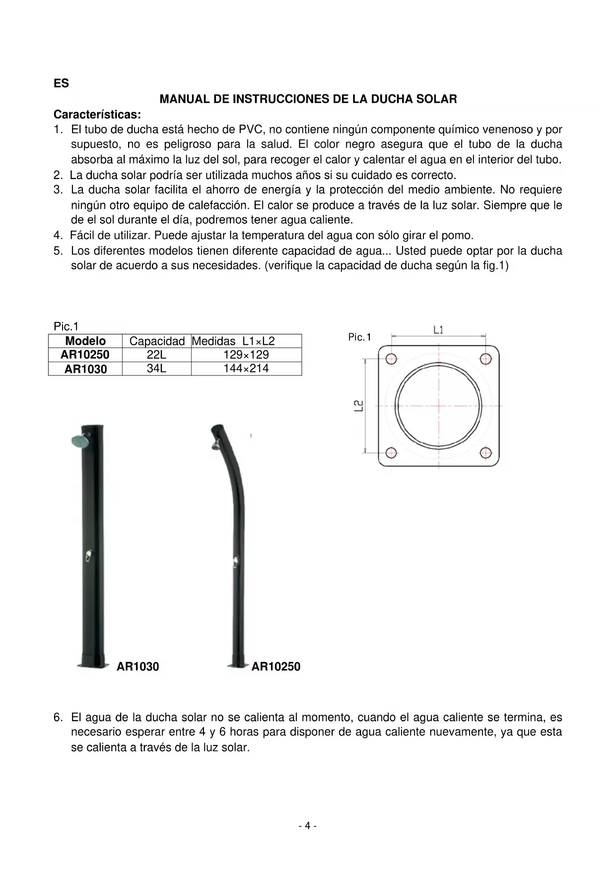 - Los differentes modelos tienen diferente capacité de agua... Usted pueda optar por la ducha solar de acuerdo a sus necessities. (verifique la capacité de ducha según la fig.1)
