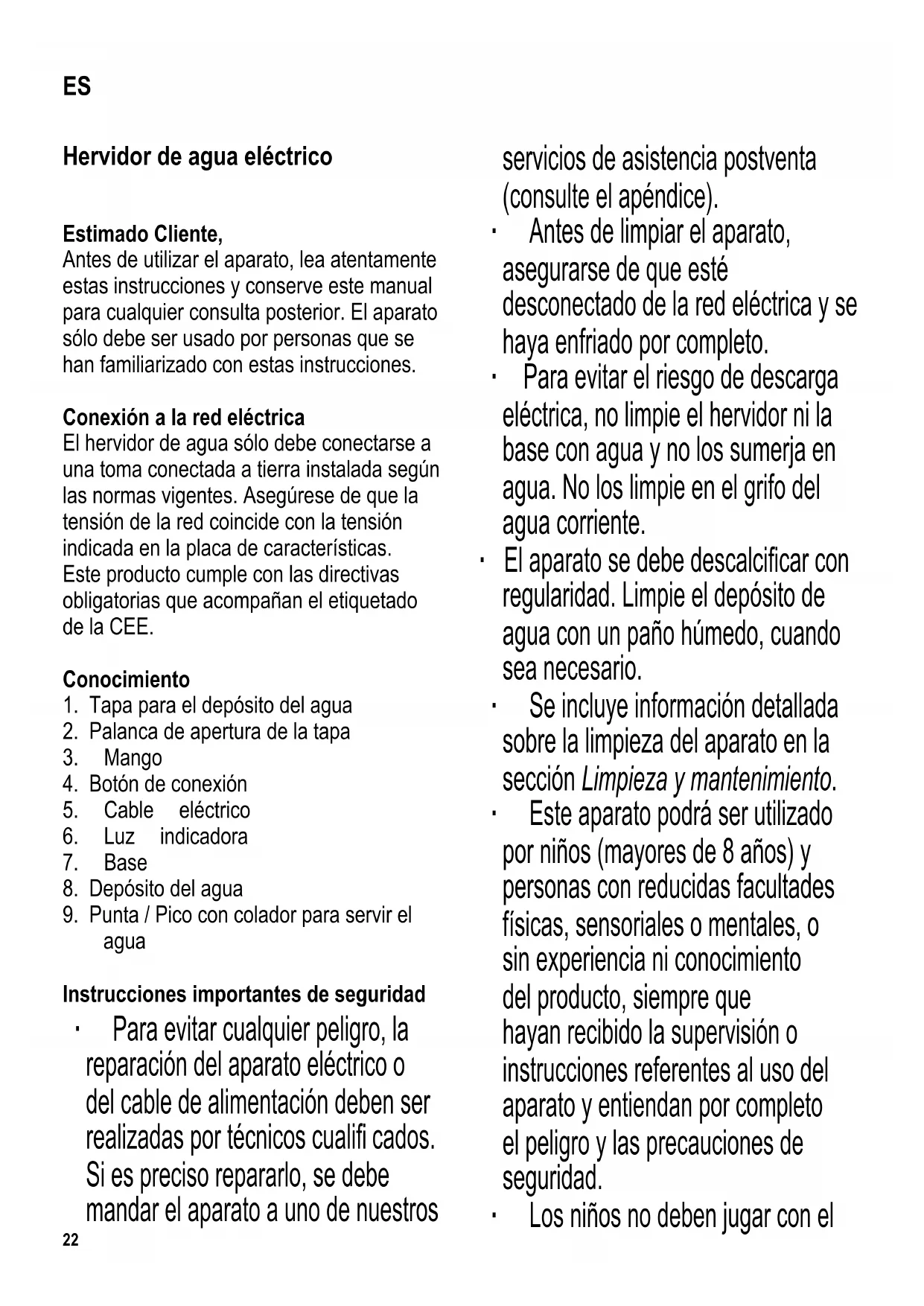 agua Instrucciones importantes de seguridad ∙ Para evitar cualquier peligro, la reparación del aparato eléctrico o del cable de alimentación deben ser realizadas por técnicos cualifi cados. Si es preciso repararlo, se debe mandar el aparato a uno de nuestros servicios de asistencia postventa (consulte el apéndice). ∙ Antes de limpiar el aparato, asegurarse de que esté desconectado de la red eléctrica y se haya enfriado por completo. ∙ Para evitar el riesgo de descarga eléctrica, no limpie el hervidor ni la base con agua y no los sumerja en agua. No los limpie en el grifo del agua corriente. ∙ El aparato se debe descalcifi car con regularidad. Limpie el depósito de agua con un paño húmedo, cuando sea necesario. ∙ Se incluye información detallada sobre la limpieza del aparato en la sección Limpieza y mantenimiento. ∙ Este aparato podrá ser utilizado por niños (mayores de 8 años) y personas con reducidas facultades físicas, sensoriales o mentales, o sin experiencia ni conocimiento del producto, siempre que hayan recibido la supervisión o instrucciones referentes al uso del aparato y entiendan por completo el peligro y las precauciones de seguridad. ∙ Los niños no deben jugar con el ES23 aparato. ∙ No se debe permitir que los niños realicen ningún trabajo de limpieza o mantenimiento del aparato a menos que esté bajo vigilancia y tengan más de 8 años. ∙ El aparato y su cable eléctrico siempre se deben mantener fuera del alcance de niños menores de 8 años. ∙ Este aparato ha sido diseñado para el uso doméstico u otra aplicación similar, por ejemplo - para ser utilizado por el personal de una tienda, ofi cina, u otros entornos similares, - en empresas agrícolas, - por los clientes de hoteles, pensiones, etc. y establecimientos similares, - en casas rurales. ∙ Las superfi cies exteriores se calientan durante el uso y se mantendrán calientes durante cierto tiempo. ∙ No deje el hervidor de agua desatendido cuando lo esté utilizando. Use siempre agua pura y al llenarlo de agua tenga siempre en cuenta las marcas de los niveles mínimo (0.5 l) y máximo (1.0 l) del agua. Si sobrepasa la capacidad del depósito puede haber peligro de que el agua salga al hervir. ∙ Tenga también cuidado de no quemarse con el vapor muy caliente generado. Por ello, no debe tocar ninguna pieza del aparato excepto el asa durante su utilización. ∙ ¡Cuidado! Durante el proceso de ebullición del agua y cuando sirva el agua caliente, debe mantener la tapa cerrada en todo momento. ∙ El hervidor sólo puede usarse con la base suministrada. ∙ No separe nunca el recipiente de agua de la base (o vuelva a colocarlo) mientras el aparato está encendido. ∙ Las conexiones eléctricas de la base se deben proteger siempre para evitar su contacto con agua. ∙ Precaución: El uso incorrecto puede provocar lesiones personales graves. ∙ Precaución: Mantenga a los niños alejados del material de embalaje, porque podría ser peligroso, existe el peligro de asfi xia. ∙ Antes de utilizar el aparato, siempre se debe comprobar que tanto la unidad principal, el cable de alimentación como cualquier accesorio no están24 defectuosos. En caso de que el aparato haya caído sobre una superfi cie dura, o se haya tirado en exceso del cable de alimentación, no se deberá utilizar de nuevo: incluso los desperfectos no visibles pueden tener efectos adversos sobre la seguridad en el uso del aparato. ∙ El aparato sólo se debe utilizar sobre una superfi cie nivelada, resistente al calor. ∙ No ponga el aparato en funcionamiento debajo de un armario empotrado u objeto similar; el vapor emitido podría quedar acumulado debajo del armario. ∙ No deje que la carcasa ni el cable entren en contacto con llamas ni con ninguna superfi cie caliente tales como platos muy calientes. ∙ No deje que el cable de la corriente cuelgue suelto y manténgalo bien alejado de las partes calientes de la carcasa. ∙ Desenchufe siempre el hervidor - después del uso, - si hay una avería y, - antes de limpiarlo. ∙ No se acepta responsabilidad alguna si hay averías a consecuencia del uso incorrecto del aparato o si estas instrucciones no han sido observadas debidamente. Desconexión térmica de seguridad El dispositivo de desconexión térmica de seguridad evita el sobrecalentamiento de la resistencia, en caso de que el aparato se encienda accidentalmente sin agua, o la resistencia térmica esté calcifi cada. Una vez que la desconexión de seguridad haya apagado el hervidor, se deberá dejar que el hervidor se enfríe sufi ciente, o se deberá descalcifi car antes de enchufarlo de nuevo. Antes de usarlo por primera vez Para garantizar la limpieza total, hierva y tire el agua hervida por primera vez. Para hervir agua ∙ Retire el depósito del agua de su base. ∙ Pulse la palanca de apertura para abrir la tapa, y llene el depósito de agua hasta el nivel deseado, respetando las señales de nivel Mín (0.5 l) y Máx (1.0 l). ∙ Cierre la tapa y vuelva a colocar el recipiente sobre la base. ∙ Enchúfelo en una toma de pared apropiada y pulse el botón de conexión. Se enciende la luz indicadora. ∙ Empieza el proceso de ebullición. Una vez que ha llegado al punto de ebullición, el aparato se apaga automáticamente con el dispositivo de corte de corriente de vapor integrado. La luz indicadora se apaga. ∙ Si quiere interrumpir el proceso de ebullición, apague el aparato con el botón de conexión. ∙ Para servir el agua, retire el depósito de su base. ∙ Para evitar la emisión de vapor, asegúrese de que la tapa está bien colocada mientras está sirviendo el agua. ∙ Después de usar el aparato desenchufe el cable eléctrico de la toma de pared (la luz indicadora roja se apagará). ∙ No deje restos de agua en el recipiente. Compartimento para enrollar el cable eléctrico El compartimento para enrollar el cable eléctrico situado en la base permite reducir la longitud del cable eléctri