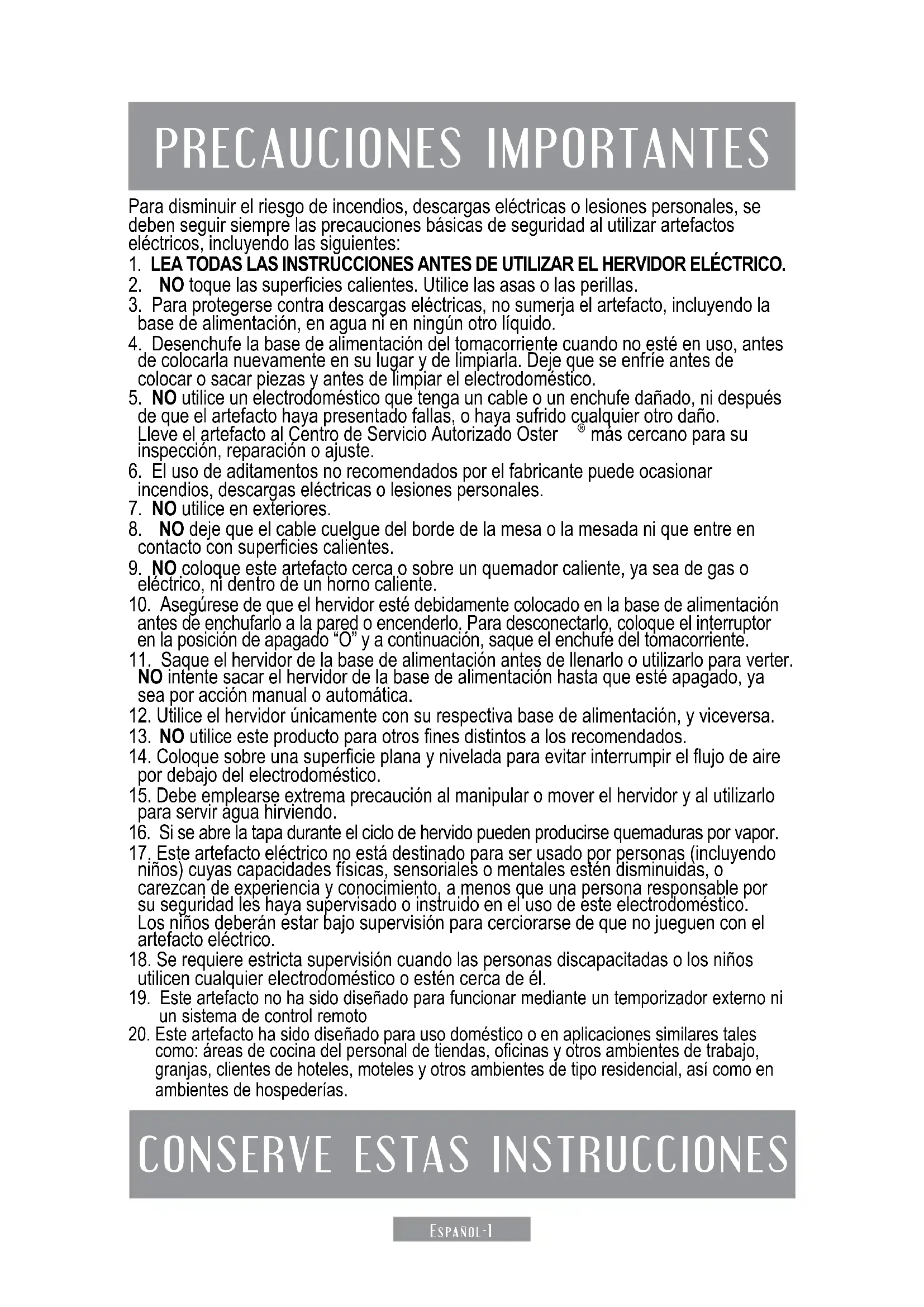 1. LEA TODAS LAS INSTRUCCIONES ANTES DE UTILIZAR EL HERVIDOR ELÉCTRICO.
