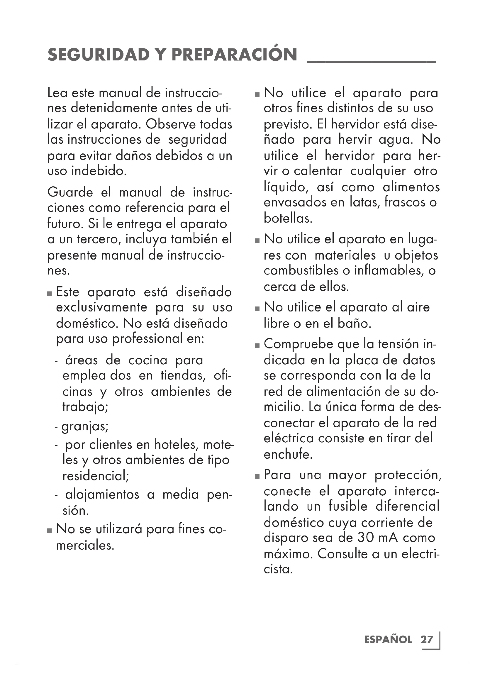 No utilice el aparato para otros fines distintos de su uso previsto. El hervidor está dise- ñado para hervir agua. No utilice el hervidor para her- vir o calentar cualquier otro líquido, así como alimentos envasados en latas, frascos o botellas.