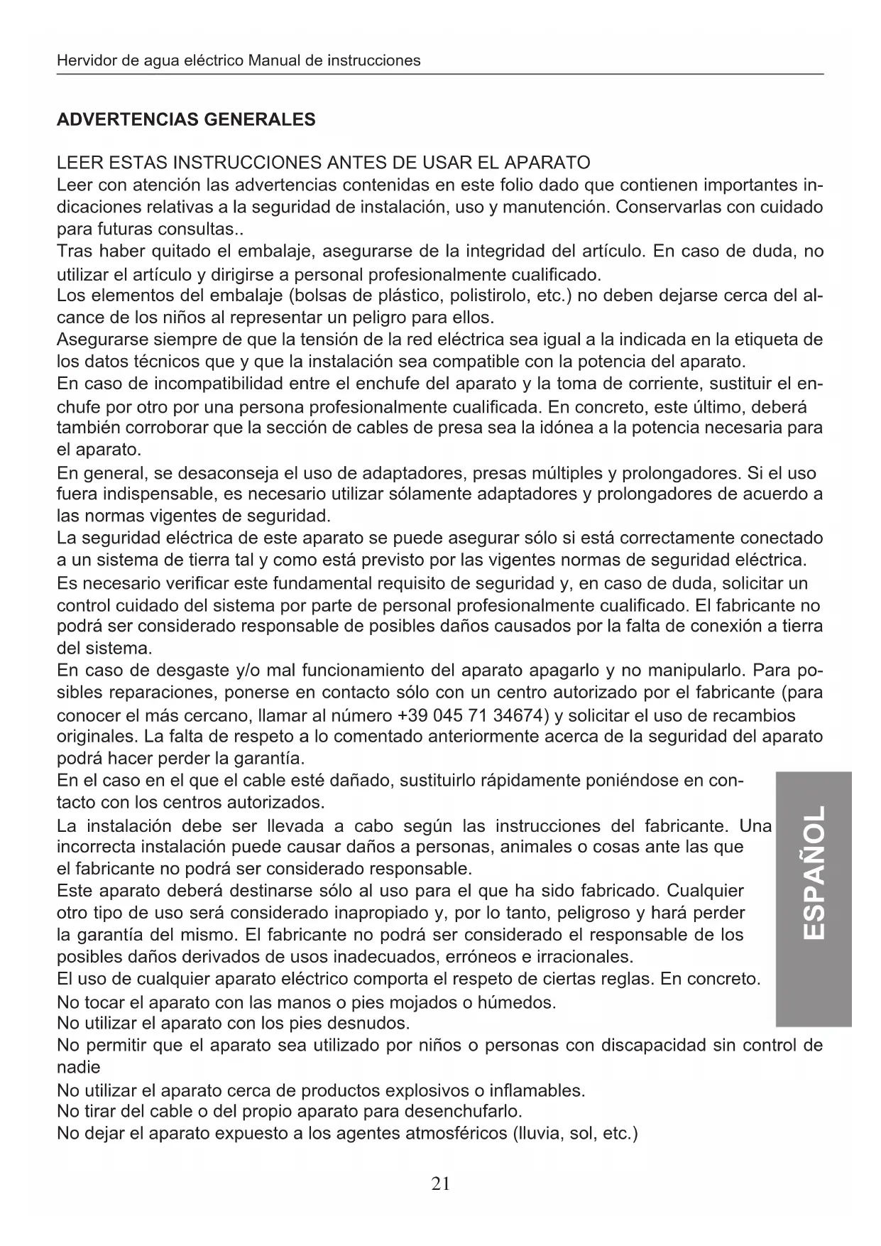 En caso de desgaste y/o mal funciona del aparato apagarlo y no Manipularlo. Para posibles reparaciones, ponerse en contacto solo con un centro autorizzato por el fabricante (para poder es más cercano, llamar al número +39 045 71 34674) y Solicitar el uso de recambios originales. La falta de respeto a lo commentado anteriorsmente acerca de la calidad del aparato podra hacer perdler la garantía.