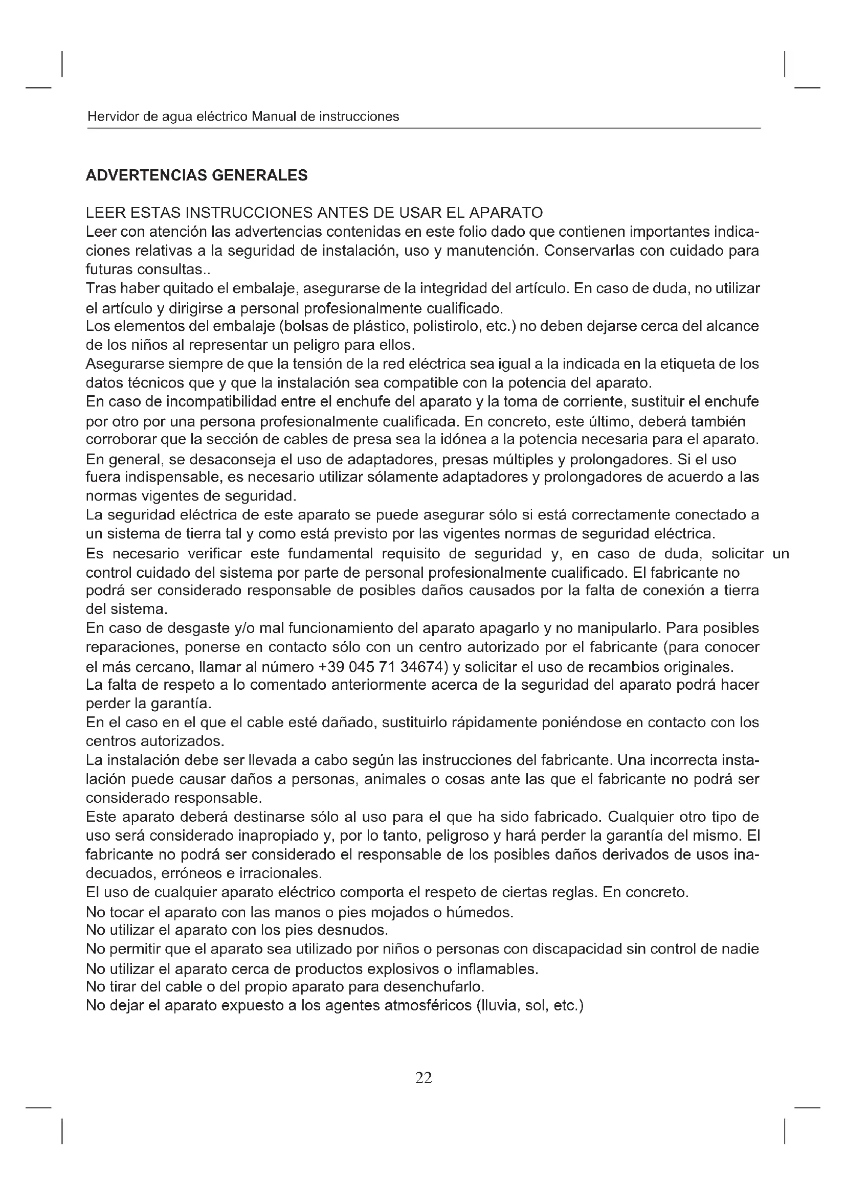 Este aparato deberá destinarse sólo al uso para el que ha sido fabricado. Cualquier otro tipo de uso será considerado inapropiado y, por lo tanto, peligroso y hará perder la garantía del mismo. El fabricante no podrá ser considerado el responsable de los posibles daños derivados de usos inadecuados, erróneos e irracionales.