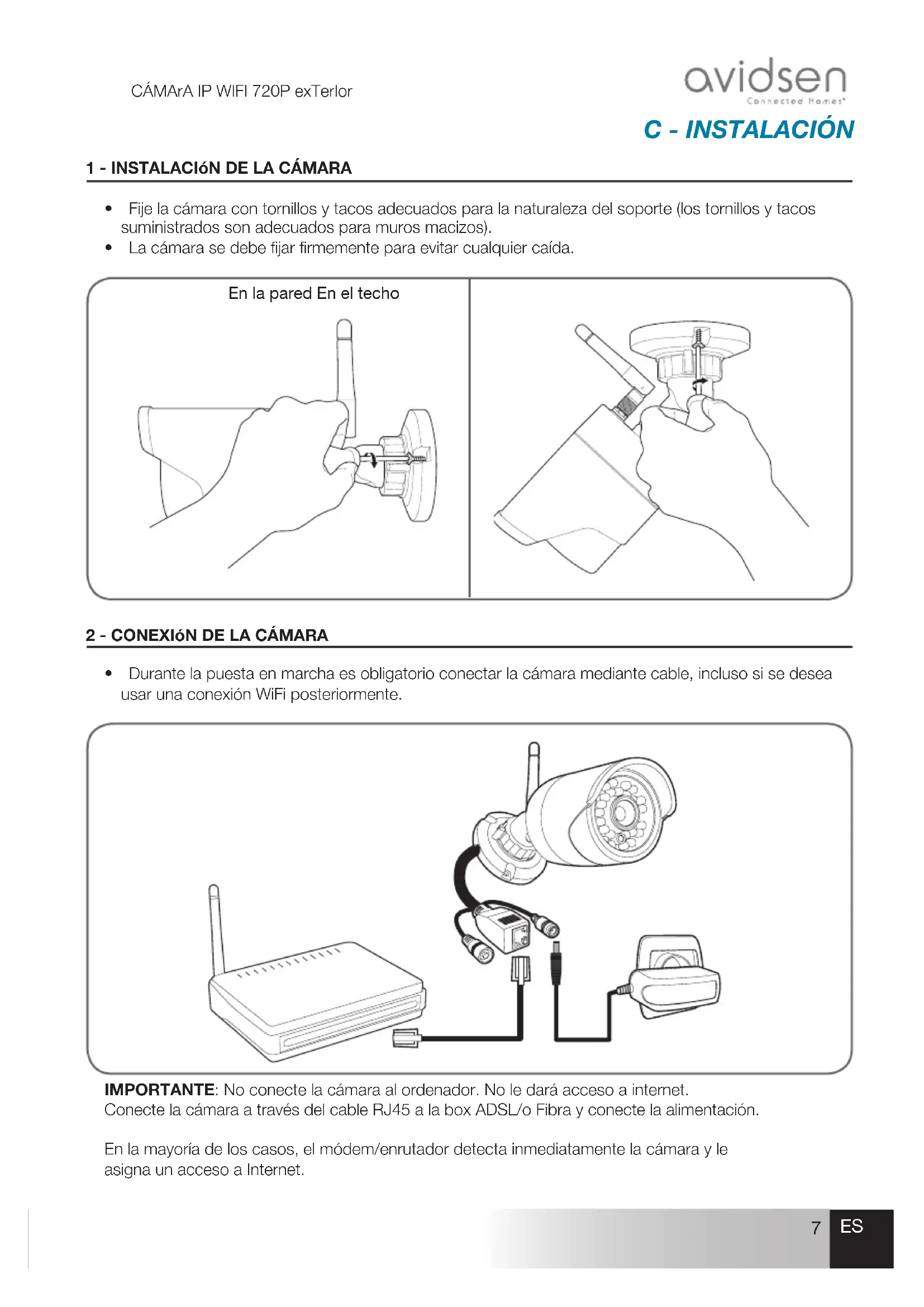 - Durantelapuestaenmarchaesobligatorioconectarlacámaramediantecable,inclusosisedesea usarunaconexiónWiFiposteriormente. IMPORTANTE:Noconectelacámaraalordenador.Noledaráaccesoainternet. ConectelacámaraatravésdelcableRJ45alaboxADSL/oFibrayconectelaalimentación. Enlamayoríadeloscasos,elmódem/enrutadordetectainmediatamentelacámarayle asignaunaccesoaInternet. Cámara IP WIFI 720P exterIor C - INstAlACIóNes
