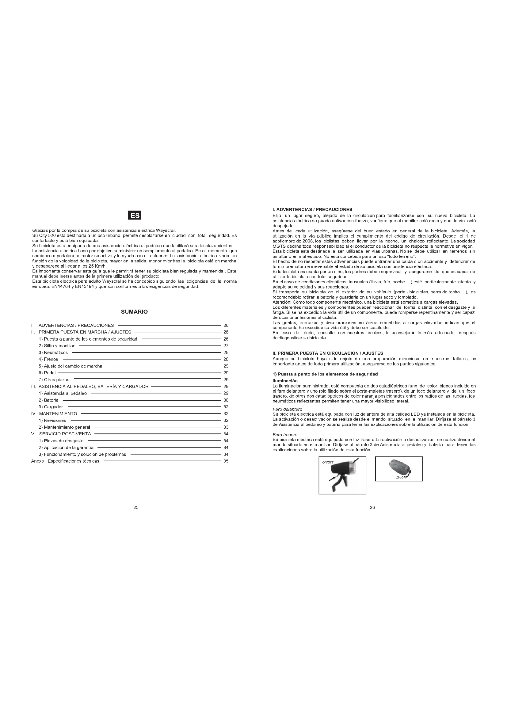 Anexo : Especificaciones técnicas Gracias por la compra de su bicicleta con asistencia eléctrica Wayscral. Su City 520 está destinada a un uso urbano, permite desplazarse en ciudad con total seguridad. Es confortable y está bien equipada. Su bicicleta está equipada de una asistencia eléctrica al pedaleo que facilitará sus desplazamientos. La asistencia eléctrica tiene por objetivo suministrar un complemento al pedaleo. En el momento que comience a pedalear, el motor se activa y le ayuda con el esfuerzo. La asistencia eléctrica varia en función de la velocidad de la bicicleta, mayor en la salida, menor mientras la bicicleta está en marcha y desaparece al llegar a los 25 Km/h. Es importante conservar esta guía que le permitirá tener su bicicleta bien regulada y mantenida . Este manual debe leerse antes de la primera utilización del producto. Esta bicicleta eléctrica para adulto Wayscral se ha concebido siguiendo las exigencias de la norma europea: EN14764 y EN15194 y que son conformes a las exigencias de seguridad.