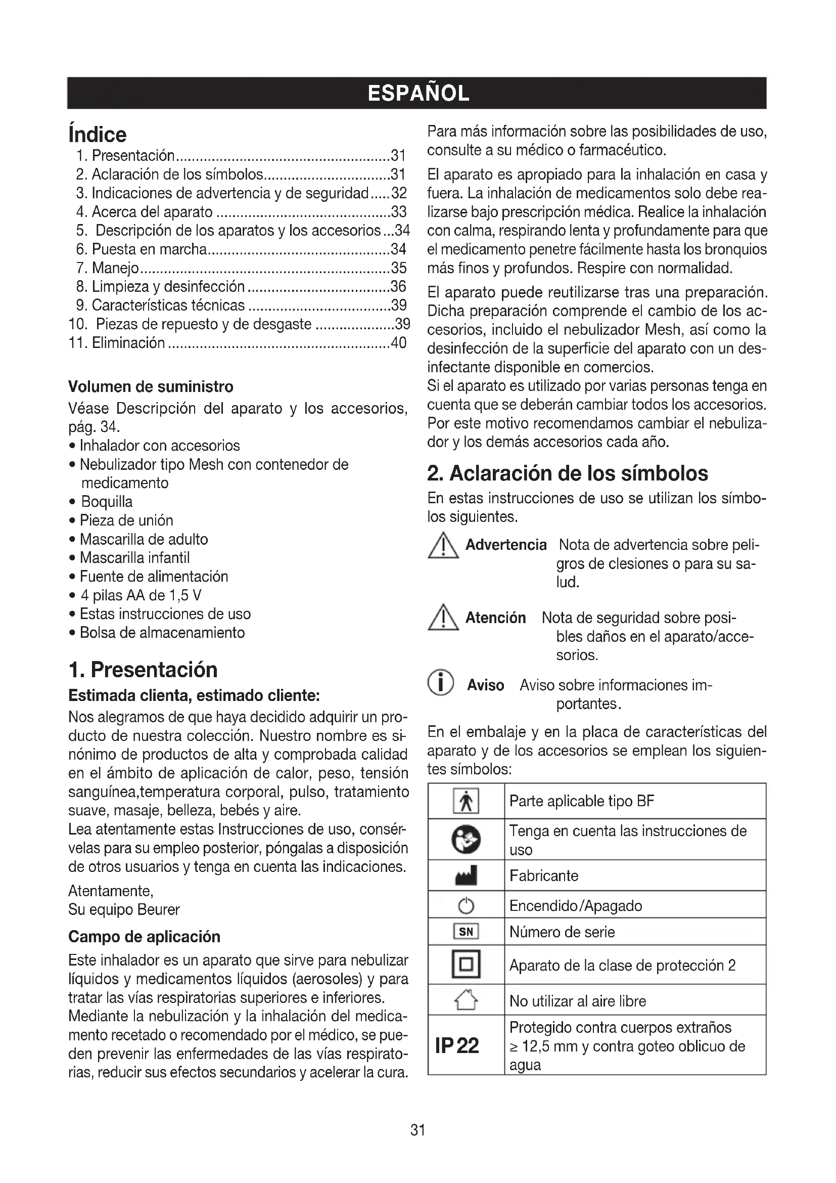 velas para su empleo posterior, póngalas a disposición de otros usuarios y tenga en cuenta las indicaciones. Atentamente, Su equipo Beurer Campo de aplicación Este inhalador es un aparato que sirve para nebulizar líquidos y medicamentos líquidos (aerosoles) y para tratar las vías respiratorias superiores e inferiores. Mediante la nebulización y la inhalación del medica- mento recetado o recomendado por el médico, se pue- den prevenir las enfermedades de las vías respirato- rias, reducir sus efectos secundarios y acelerar la cura. Para más información sobre las posibilidades de uso, consulte a su médico o farmacéutico. El aparato es apropiado para la inhalación en casa y fuera. La inhalación de medicamentos solo debe rea