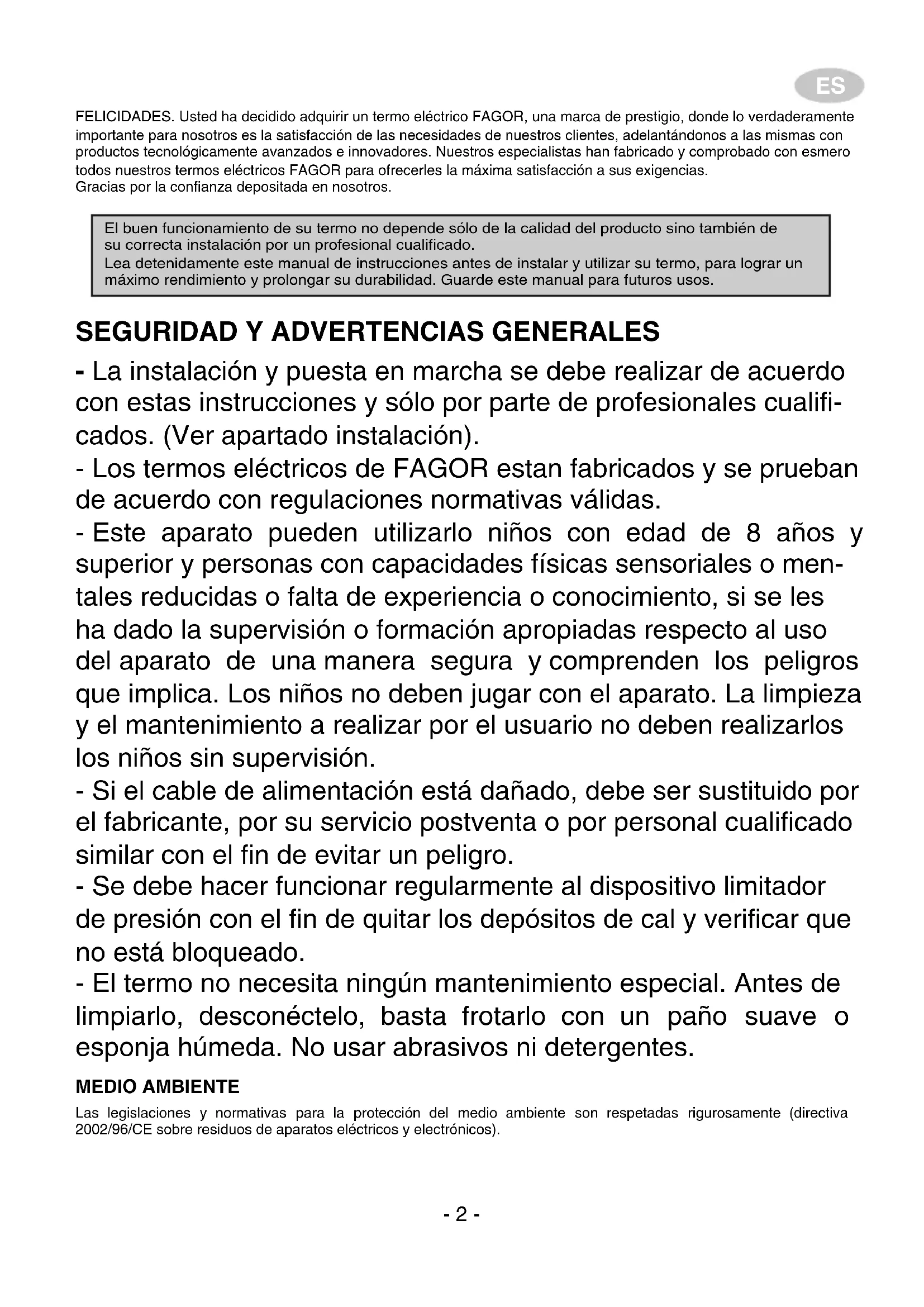 - La instalación y puesta en marcha se debe realizar de acuerdo con estas instrucciones y sólo por parte de profesionales cualifi- cados. (Ver apartado instalación). - Los termos eléctricos de FAGOR estan fabricados y se prueban de acuerdo con regulaciones normativas válidas. - Este aparato pueden utilizarlo niños con edad de 8 años y superior y personas con capacidades físicas sensoriales o men- tales reducidas o falta de experiencia o conocimiento, si se les ha dado la supervisión o formación apropiadas respecto al uso del aparato de una manera segura y comprenden los peligros que implica. Los niños no deben jugar con el aparato. La limpieza y el mantenimiento a realizar por el usuario no deben realizarlos los niños sin supervisión. - Si el cable de alimentación está dañado, debe ser sustituido por el fabricante, por su servicio postventa o por personal cualificado similar con el fin de evitar un peligro. - Se debe hacer funcionar regularmente al dispositivo limitador de presión con el fin de quitar los depósitos de cal y verificar que no está bloqueado. - El termo no necesita ningún mantenimiento especial. Antes de limpiarlo, desconéctelo, basta frotarlo con un paño suave o esponja húmeda. No usar abrasivos ni detergentes. MEDIO AMBIENTE Las legislaciones y normativas para la protección del medio ambiente son respetadas rigurosamente (directiva 2002/96/CE sobre residuos de aparatos eléctricos y electrónicos).