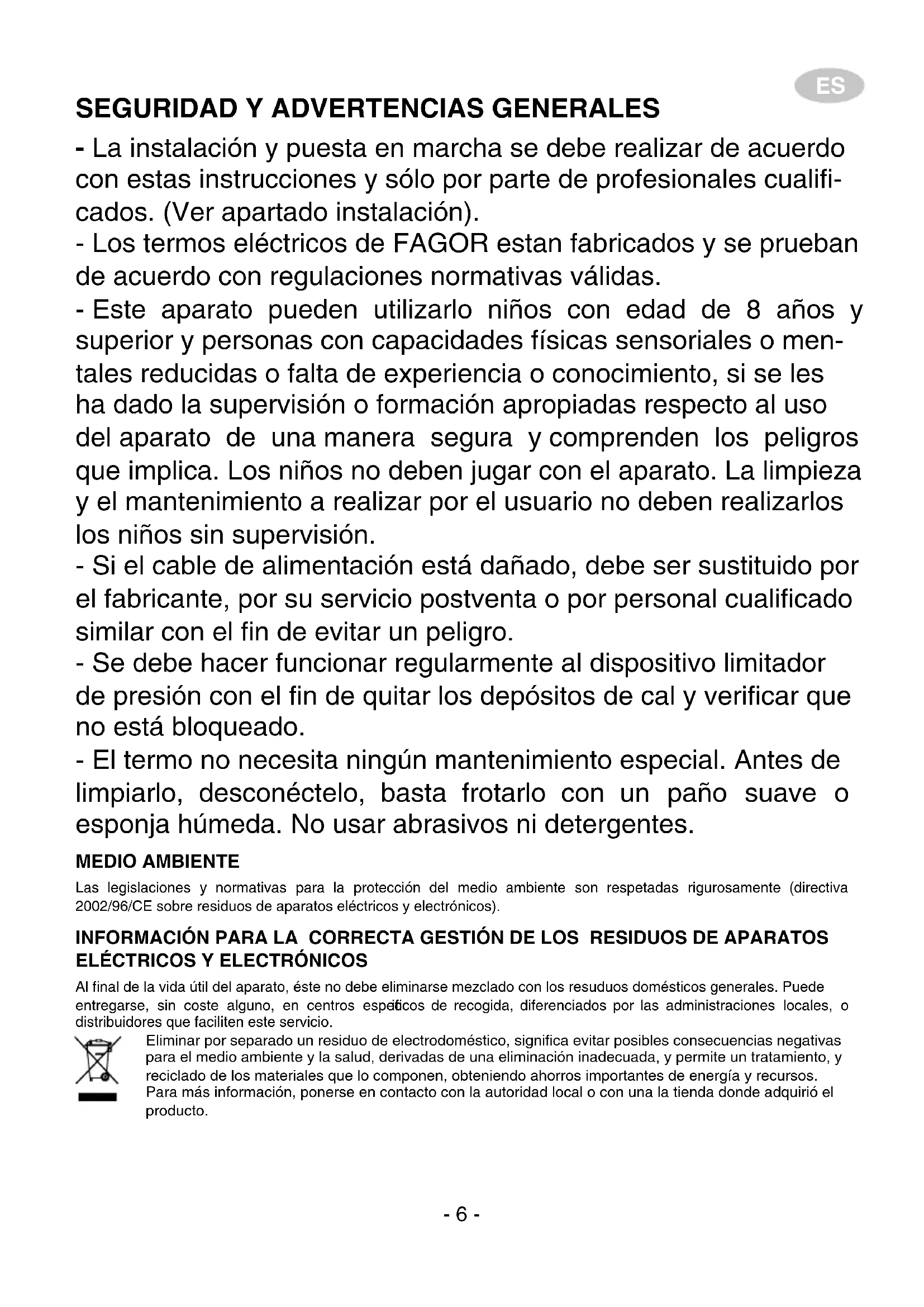 - La instalación y puesta en marcha se debe realizar de acuerdo con estas instrucciones y sólo por parte de profesionales cualifi- cados. (Ver apartado instalación). - Los termos eléctricos de FAGOR estan fabricados y se prueban de acuerdo con regulaciones normativas válidas. - Este aparato pueden utilizarlo niños con edad de 8 años y superior y personas con capacidades físicas sensoriales o men- tales reducidas o falta de experiencia o conocimiento, si se les ha dado la supervisión o formación apropiadas respecto al uso del aparato de una manera segura y comprenden los peligros que implica. Los niños no deben jugar con el aparato. La limpieza y el mantenimiento a realizar por el usuario no deben realizarlos los niños sin supervisión. - Si el cable de alimentación está dañado, debe ser sustituido por el fabricante, por su servicio postventa o por personal cualificado similar con el fin de evitar un peligro. - Se debe hacer funcionar regularmente al dispositivo limitador de presión con el fin de quitar los depósitos de cal y verificar que no está bloqueado. - El termo no necesita ningún mantenimiento especial. Antes de limpiarlo, desconéctelo, basta frotarlo con un paño suave o esponja húmeda. No usar abrasivos ni detergentes. MEDIO AMBIENTE Las legislaciones y normativas para la protección del medio ambiente son respetadas rigurosamente (directiva 2002/96/CE sobre residuos de aparatos eléctricos y electrónicos). INFORMACIÓN PARA LA CORRECTA GESTIÓN DE LOS RESIDUOS DE APARATOS