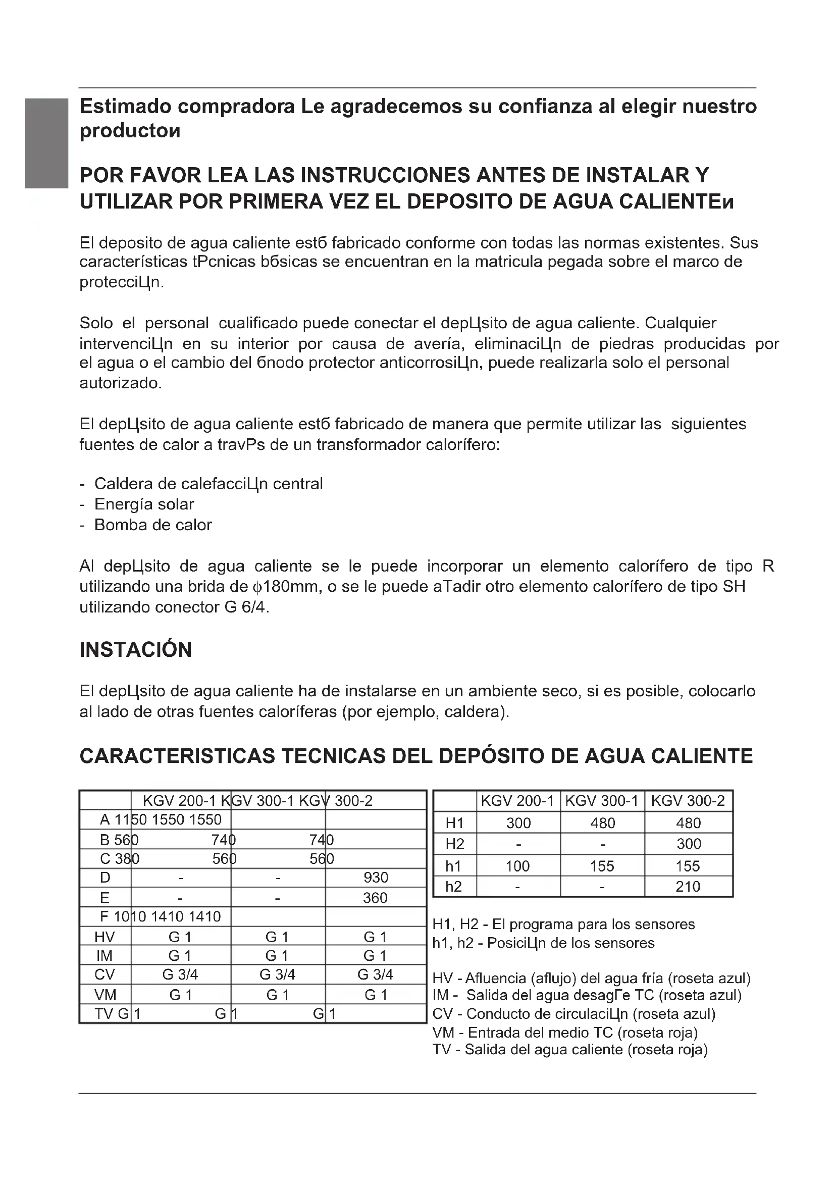 H1 300 480 480 H2 - - 300 h1 100 155 155 h2 - - 210 H1, H2 - El programa para los sensores h1, h2 - Posición de los sensores HV - Afluencia (aflujo) del agua fría (roseta azul) IM - Salida del agua desagüe TC (roseta azul) CV - Conducto de circulación (roseta azul) VM - Entrada del medio TC (roseta roja) TV - Salida del agua caliente (roseta roja) l¡¥ Termómetro Tipo KGV 200-1 KGV 300-1 KGV 300-2 Volumen [l] 200 285 280 Presión [MPa] 0,6 Masa / llenado de agua [kg] 82 / 282 112 / 397 134 / 414 Protección anticorrosión de caldera Esmalte / ánodo Mg