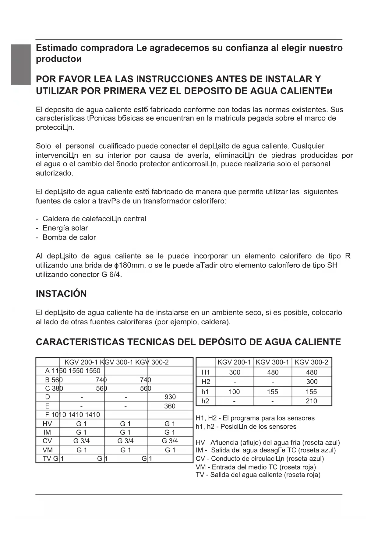 H1 300 480 480 H2 - - 300 h1 100 155 155 h2 - - 210 H1, H2 - El programa para los sensores h1, h2 - Posición de los sensores HV - Afluencia (aflujo) del agua fría (roseta azul) IM - Salida del agua desagüe TC (roseta azul) CV - Conducto de circulación (roseta azul) VM - Entrada del medio TC (roseta roja) TV - Salida del agua caliente (roseta roja) l¡¥ Termómetro Tipo KGV 200-1 KGV 300-1 KGV 300-2 Volumen [l] 200 285 280 Presión [MPa] 0,6 Masa / llenado de agua [kg] 82 / 282 112 / 397 134 / 414 Protección anticorrosión de caldera Esmalte / ánodo Mg