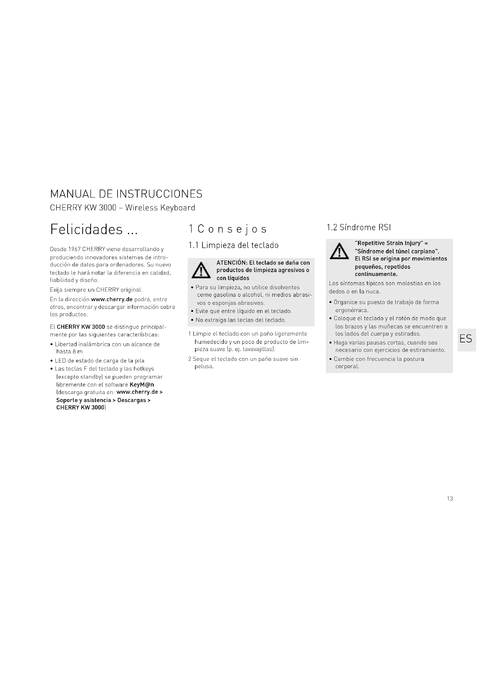 CHERRY KW 3000 – Wireless Keyboard FR13 Felicidades ... Desde 1967 CHERRY viene desarrollando y produciendo innovadores sistemas de intro- ducción de datos para ordenadores. Su nuevo teclado le hará notar la diferencia en calidad, fiabilidad y diseño. Exija siempre un CHERRY original. En la dirección www.cherry.de podrá, entre otros, encontrar y descargar información sobre los productos. El CHERRY KW 3000 se distingue principal- mente por las siguientes características:
