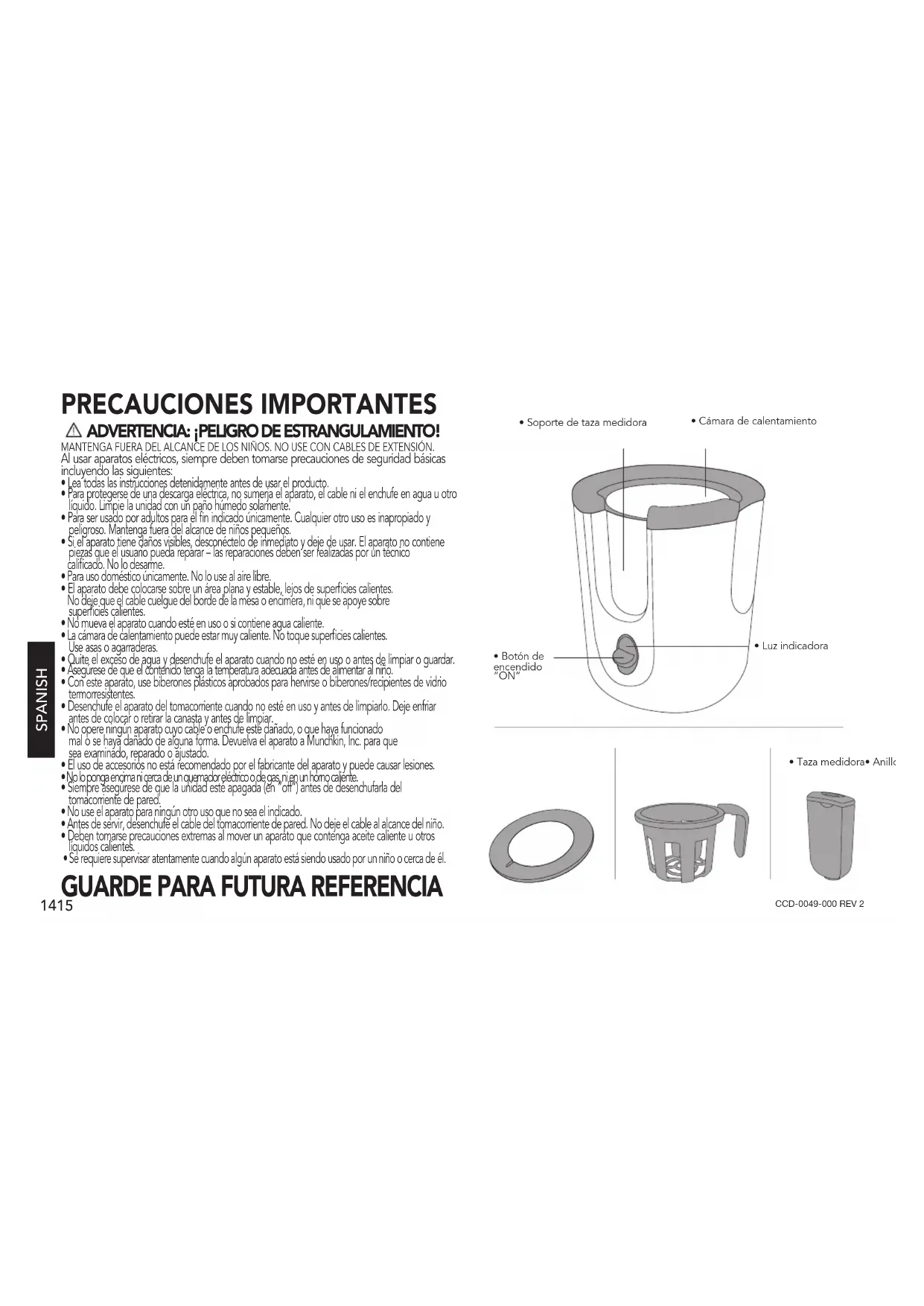 - Este producto no debe ser usado por niños ni por individuos con capacidades físicas o mentales reducidas a menos que hayan sido instruidos o sean supervisados en el uso apropiado de este producto por una persona responsable por su seguridad. PARA LIMPIAR: Siempre desenchufe la unidad y asegúrese de que se haya enfriado antes de limpiarla. Unidad del calentador de biberones: Limpie la supercie de la unidad y el interior de la cámara de calentamiento con una esponja o paño húmedo y jabón líquido suave. Limpie con agua limpia. No sumerja la unidad.Taza medidora, canasta y anillo adaptador: Pueden lavarse en la parte superior del lavaplatos o a mano usando agua con jabón. Enjuague con agua limpia. Deje secar al aire. No use paños para fregar, abrasivos ni solventes para limpiar; podrían dañar el aparato y sus supercies. PARA QUITAR EL SARRO: Se recomienda quitarle el sarro al calentador de biberones cada cuatro semanas para asegurarse de que siga funcionando apropiadamente. Para quitar el sarro, mezcle 2 oz (50 ml) de vinagre blanco con 4 oz (100 ml) de agua fría y vierta la mezcla en el calentador de biberones.Permita que el líquido repose dentro de la unidad hasta que todos los depósitos (calcáreos) se hayan disuelto. Deseche el líquido y enjuague con agua limpia. Cualquier otro tipo de mantenimiento del aparato deberá ser realizado por un representante de servicio autorizado.