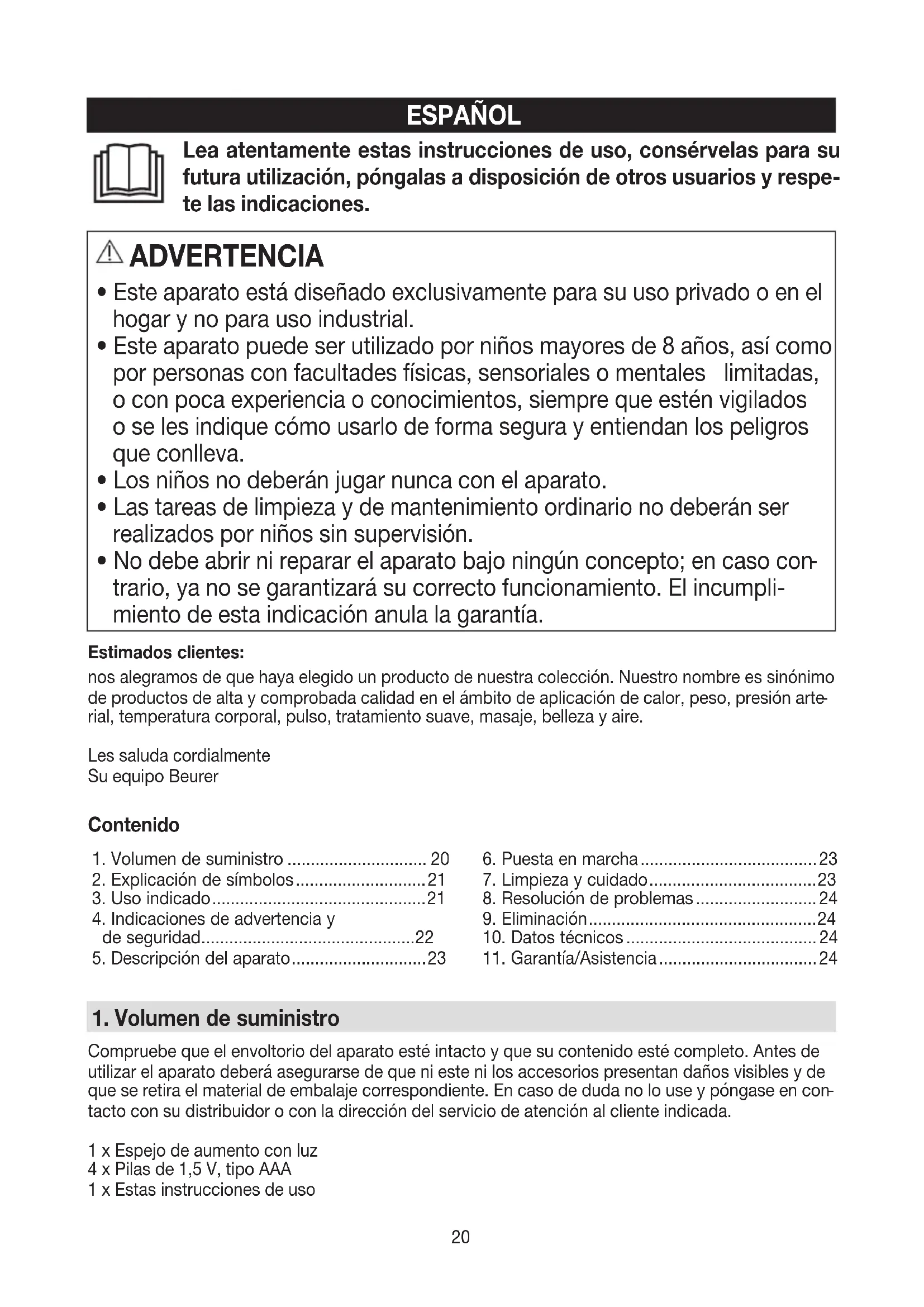 - Compruebe que el envoltorio del aparato esté intacto y que su contenido esté completo. Antes de utilizar el aparato deberá asegurarse de que ni este ni los accesorios presentan daños visibles y de que se retira el material de embalaje correspondiente. En caso de duda no lo use y póngase en con tacto con su distribuidor o con la dirección del servicio de atención al cliente indicada.1 x Espejo de aumento con luz 4 x Pilas de 1,5 V, tipo AAA1 x Estas instrucciones de uso ESPAÑOL Contenido 1. Volumen de suministro p. 202