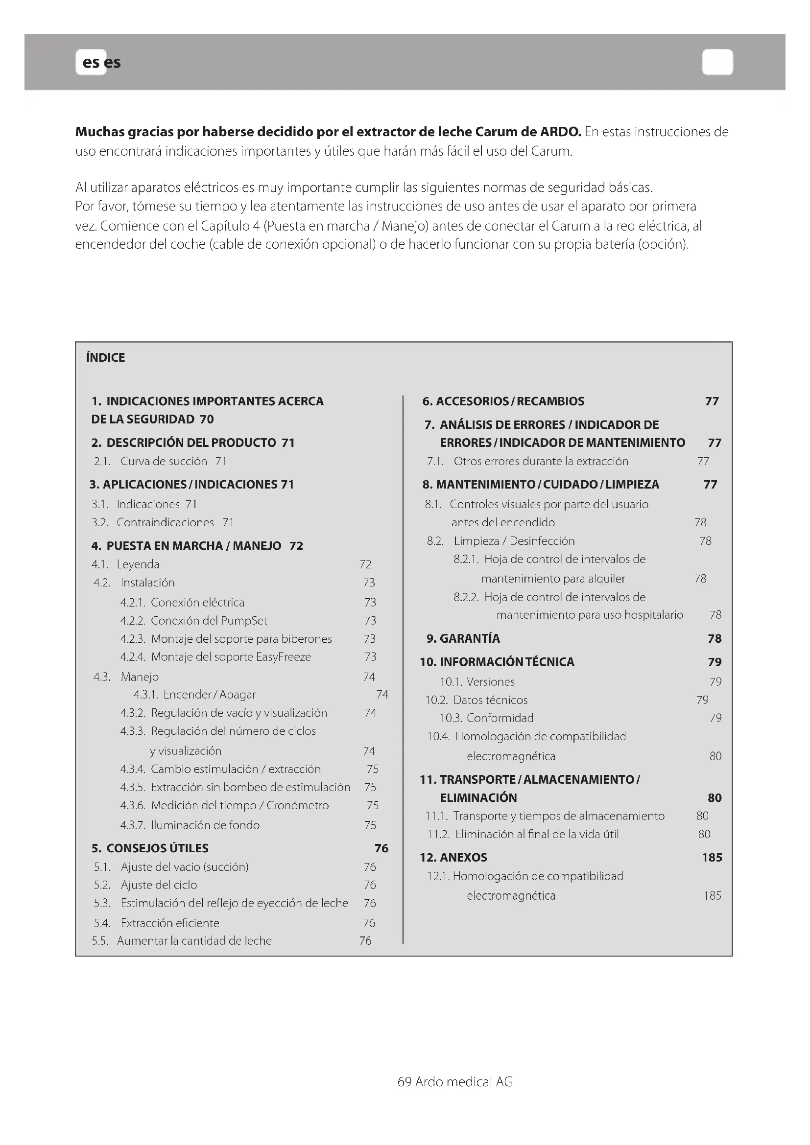 Eltiempodegarantíaasciendea3añosapartirdelafechadecompra(eljusticantedecompraconfechasirve como resguardo de garantía). Condiciones generales ArdomedicalAGgarantizalaausenciadedefectosmaterialesydefabricacióndelosproductosquefabrica.El tiempo de garantía es válido a partir de la fecha de la factura. El material defectuoso se sustituirá gratuitamente duranteeltiempodegarantíasiempreycuandonosehayamanejadodeformainadecuada.Paraasegurar el derecho de garantía y un funcionamiento correcto del aparato, se deben seguir las indicaciones de las instrucciones de uso y solo se deben utilizar accesorios de Ardo medical AG. El derecho de garantía se extingue si se realizan modificaciones en o dentro del aparato.es es 79 Ardo medical AG
