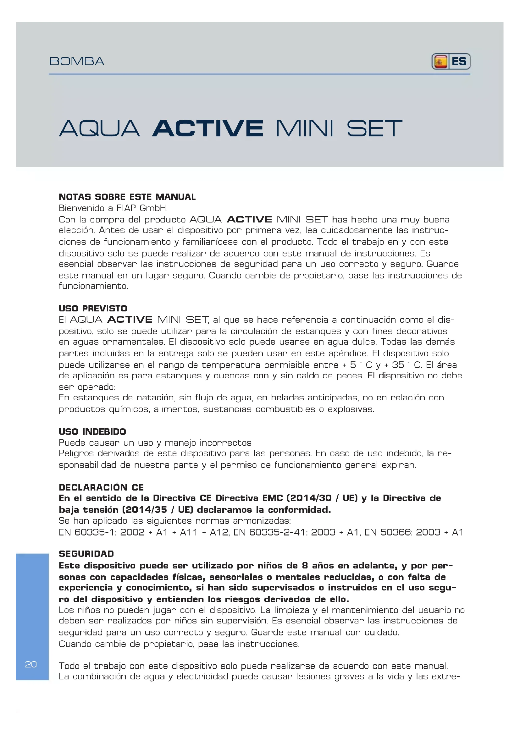 Con la compra del producto AQUA ACTIVE MINI SET has hecho una muy buena elección. Antes de usar el dispositivo por primera vez, lea cuidadosamente las instrucciones de funcionamiento y familiarícese con el producto. Todo el trabajo en y con este dispositivo solo se puede realizar de acuerdo con este manual de instrucciones. Es esencial observar las instrucciones de seguridad para un uso correcto y seguro. Guarde este manual en un lugar seguro. Cuando cambie de propietario, pase las instrucciones de funcionamiento.