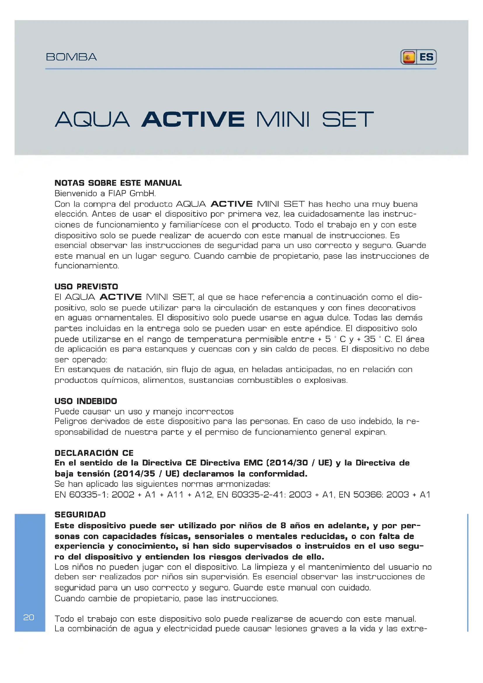Con la compra del producto AQUA ACTIVE MINI SET has hecho una muy buena elección. Antes de usar el dispositivo por primera vez, lea cuidadosamente las instrucciones de funcionamiento y familiarícese con el producto. Todo el trabajo en y con este dispositivo solo se puede realizar de acuerdo con este manual de instrucciones. Es esencial observar las instrucciones de seguridad para un uso correcto y seguro. Guarde este manual en un lugar seguro. Cuando cambie de propietario, pase las instrucciones de funcionamiento.
