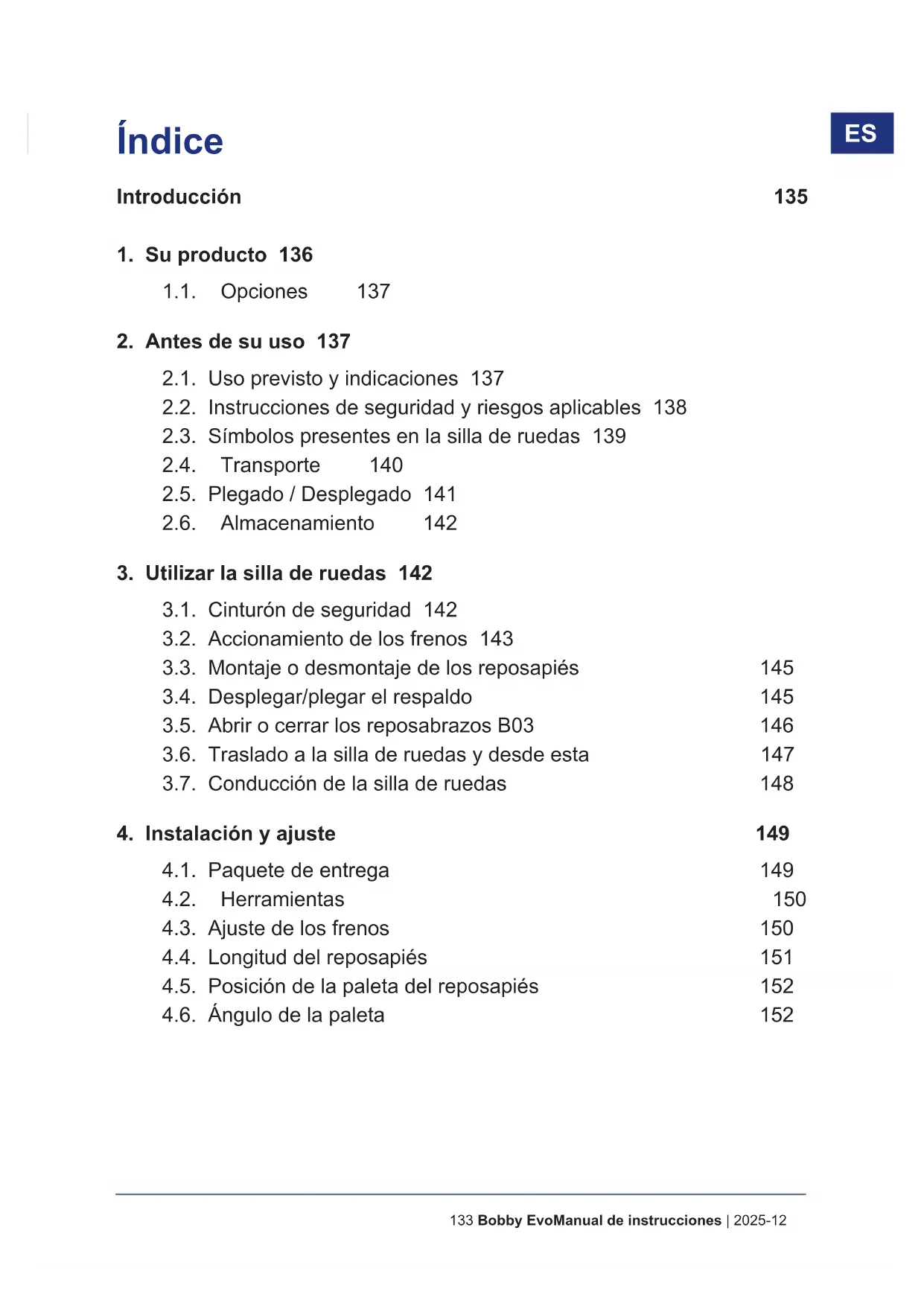 5.6. Fin de vida útil Al nal de la vida útil, deberá desechar la silla de ruedas siguiendo las leyes medioambientales de su localidad. Para transportar materiales reciclables de la silla de ruedas de manera más cómoda, se recomienda que se desmonte primero. 5.7. Garantía La garantía de este producto está sujeta a las condiciones generales de cada país.157 Bobby EvoManual de instrucciones | 2025-12