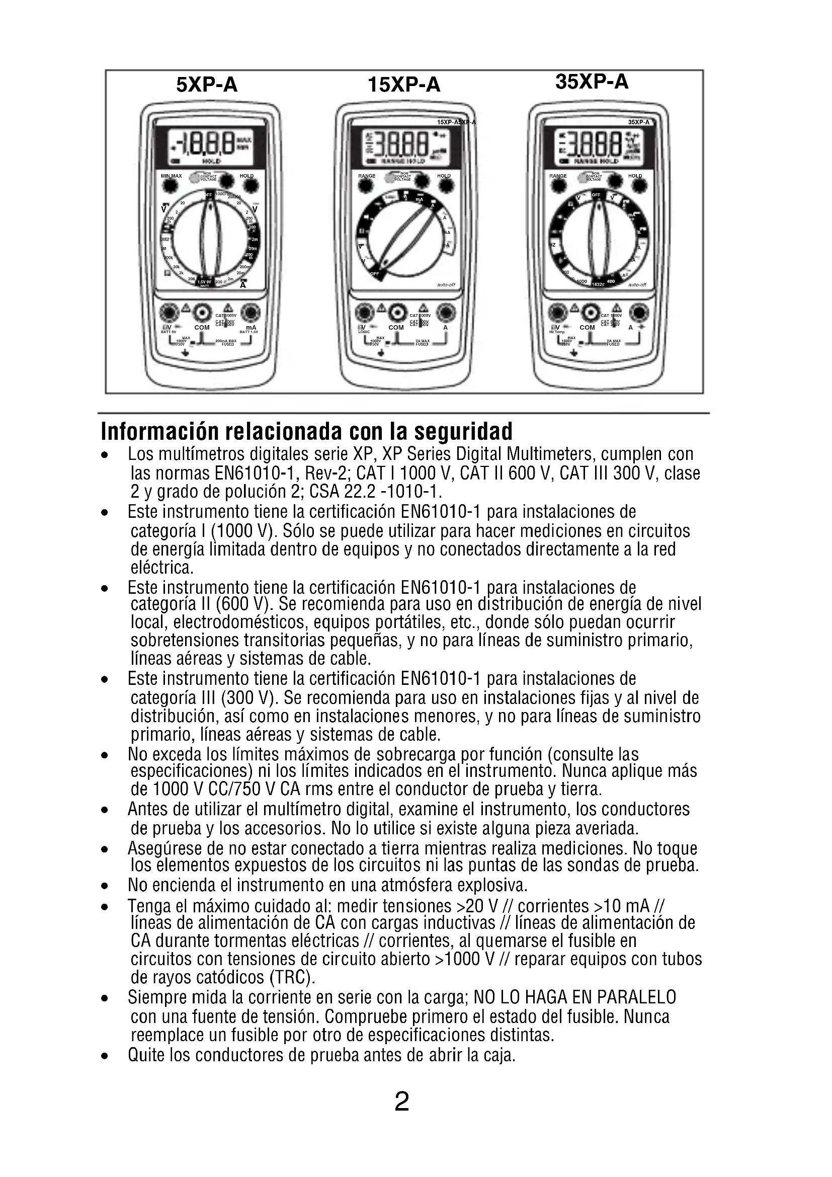 - Los multímetros digitales serie XP, XP Series Digital Multimeters, cumplen con las normas EN61010-1, Rev-2; CAT I 1000 V, CAT II 600 V, CAT III 300 V, clase 2 y grado de polución 2; CSA 22.2 -1010-1.