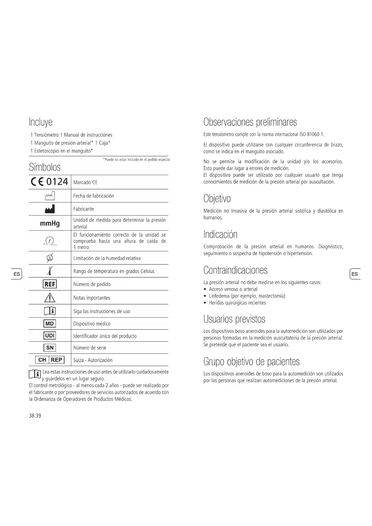 Marcado CE Fecha de fabricación Fabricante mmHg Unidad de medida para determinar la presión arterial El funcionamiento correcto de la unidad se comprueba hasta una altura de caída de 1 metro Limitación de la humedad relativa Rango de temperatura en grados Celsius Número de pedido Notas importantes Siga las instrucciones de uso Dispositivo médico Identificador único del producto Número de serie Suiza - Autorización Lea estas instrucciones de uso antes de utilizarlo cuidadosamente y guárdelos en un lugar seguro. El control metrológico - al menos cada 2 años - puede ser realizado por el fabricante o por proveedores de servicios autorizados de acuerdo con la Ordenanza de Operadores de Productos Médicos. Observaciones preliminares Este tensiómetro cumple con la norma internacional ISO 81060-1. El dispositivo puede utilizarse con cualquier circunferencia de brazo, como se indica en el manguito asociado. No se permite la modificación de la unidad y/o los accesorios. Estopuede dar lugar a errores de medición. El dispositivo puede ser utilizado por cualquier usuario que tenga conocimientos de medición de la presión arterial por auscultación. Objetivo Medición no invasiva de la presión arterial sistólica y diastólica en humanos. Indicación Comprobación de la presión arterial en humanos. Diagnóstico, seguimiento o sospecha de hipotensión o hipertensión. Contraindicaciones La presión arterial no debe medirse en los siguientes casos: