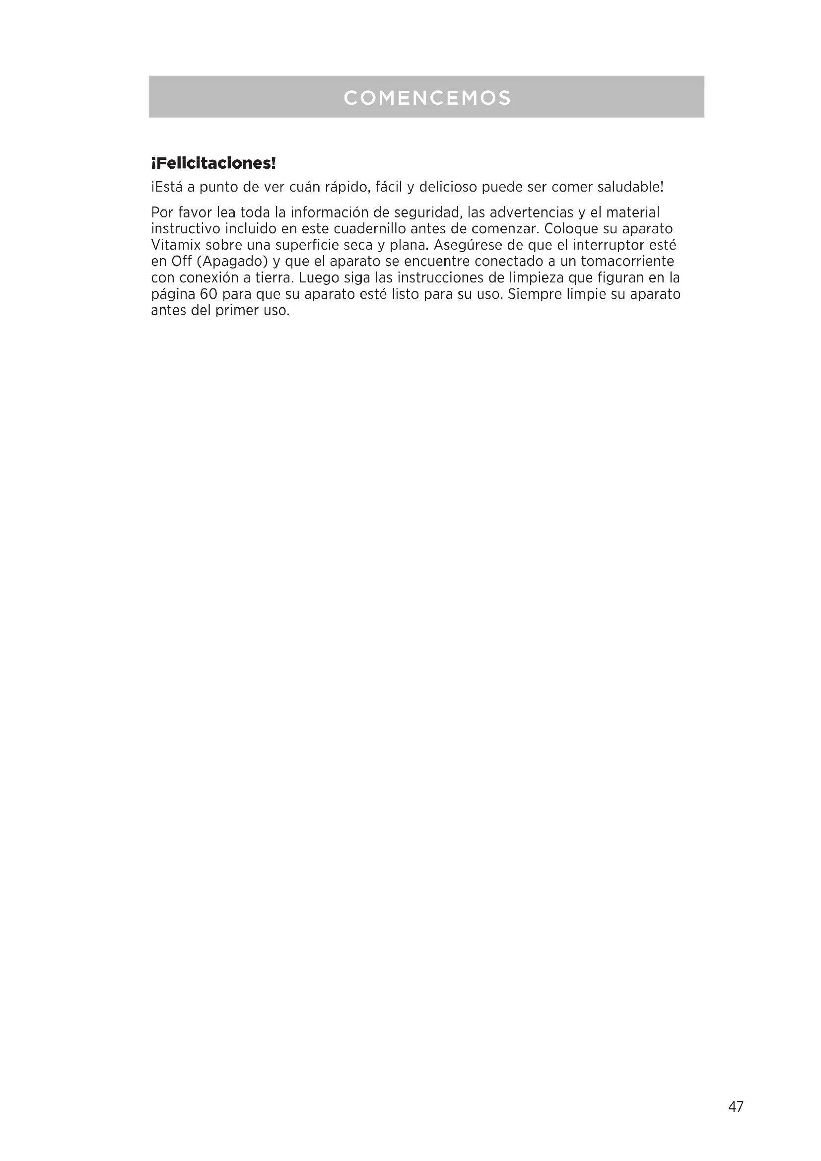 - Especificaciones CONTENIDOS47 ¡Felicitaciones! ¡Está a punto de ver cuán rápido, fácil y delicioso puede ser comer saludable! Por favor lea toda la información de seguridad, las advertencias y el material instructivo incluido en este cuadernillo antes de comenzar. Coloque su aparato Vitamix sobre una superficie seca y plana. Asegúrese de que el interruptor esté en Off (Apagado) y que el aparato se encuentre conectado a un tomacorriente con conexión a tierra. Luego siga las instrucciones de limpieza que figuran en la página 60 para que su aparato esté listo para su uso. Siempre limpie su aparato antes del primer uso. COMENCEMOS48 Servicio de Vitamix Registre el número de modelo y el número de serie de su Vitamix en los espacios que se proporcionan más abajo para tenerlos como referencia en el futuro. Estos números se encuentran en la parte trasera de la base del motor. Número de modelo Número de serie Fecha de compra Comprado a Antes de devolver este producto por cualquier motivo, inclusive la reparación, primero contacte al Servicio de Atención al Cliente de Vitamix al 1-800-848-2649 o 1-440-235-4840, comuníquese por correoelectrónico a service@vitamix.com o contacte a su proveedor local. Registro del producto Si ha adquirido su aparato Vitamix® directamente de Vita-Mix® Corporation a través del sitio web de la compañía o a través del call center por teléfono, su producto fue registrado al momento de la compra y la garantía de su aparato Vitamix ya fue activada. Si adquirió su aparato Vitamix de un distribuidor o proveedor internacional fuera de los Estados Unidos, Canadá, el Reino Unido o Irlanda, su producto está garantizado a través de ese distribuidor o proveedor internacional y no necesitará ser registrado ante Vita-Mix Corporation. Su aparato no se encontrará registrado ante Vitamix si: p. 64