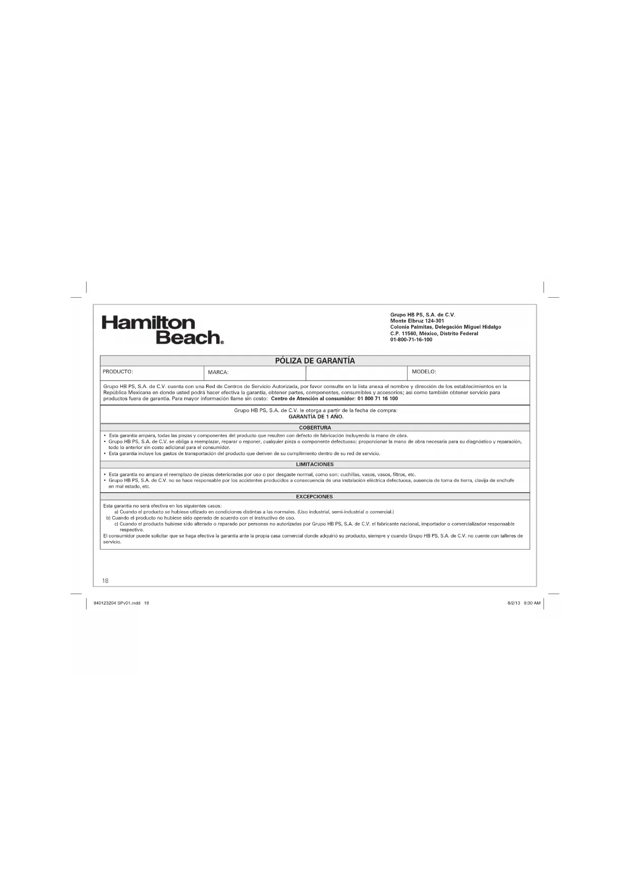 EXCEPCIONES Esta garantía no será efectiva en los siguientes casos: a) Cuando el producto se hubiese utlizado en condiciones distintas a las normales. (Uso industrial, semi-industrial o comercial.) b) Cuando el producto no hubiese sido operado de acuerdo con el instructivo de uso. c) Cuando el producto hubiese sido alterado o reparado por personas no autorizadas por Grupo HB PS, S.A. de C.V. el fabricante nacional, importador o comercializador responsable respectivo. El consumidor puede solicitar que se haga efectiva la garantía ante la propia casa comercial donde adquirió su producto, siempre y cuando Grupo HB PS, S.A. de C.V. no cuente con talleres de servicio. 840123204 SPv01.indd 18840123204 SPv01.indd 18 8/2/13 9:30 AM8/2/13 9:30 AM19