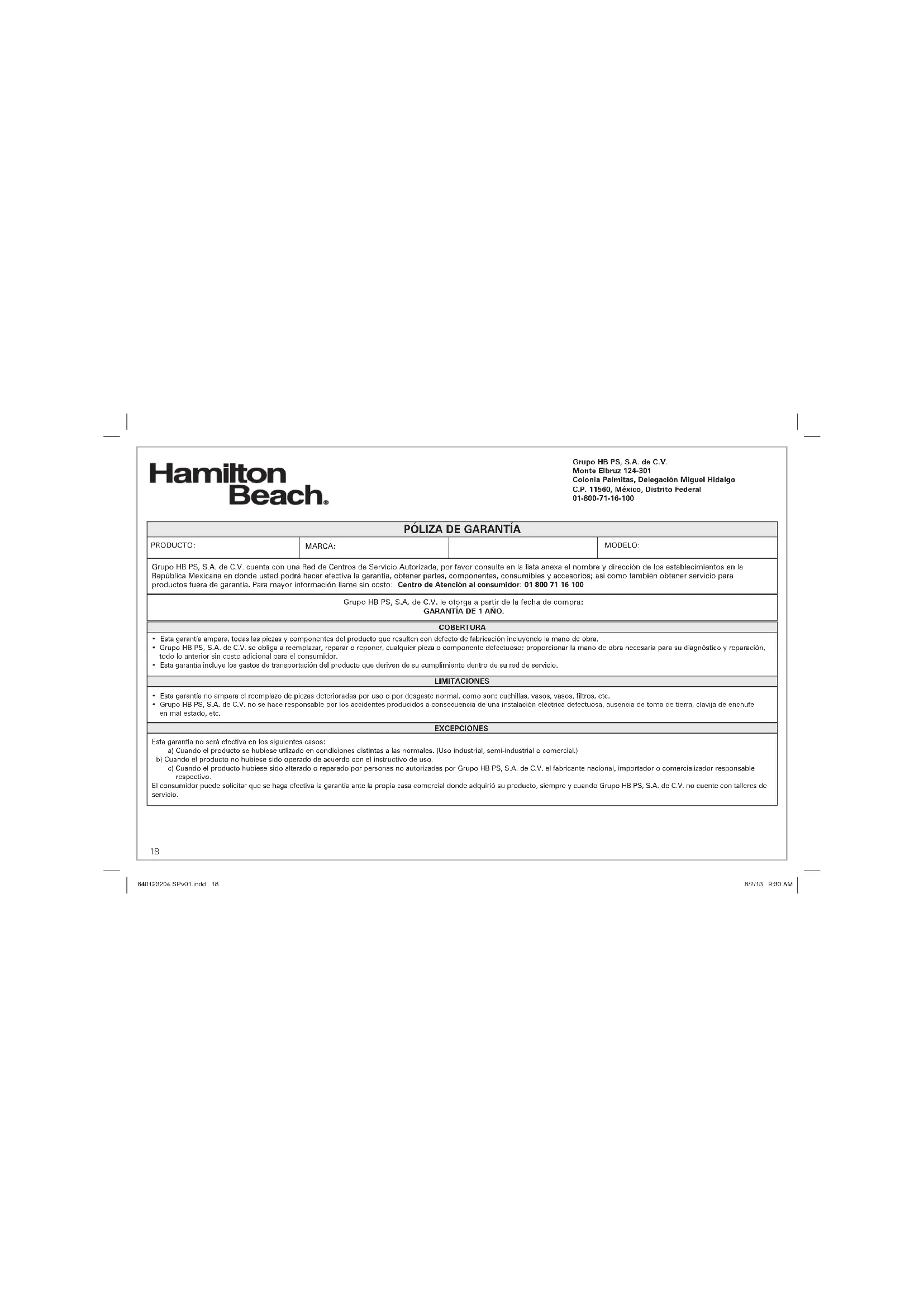 EXCEPCIONES Esta garantía no será efectiva en los siguientes casos: a) Cuando el producto se hubiese utlizado en condiciones distintas a las normales. (Uso industrial, semi-industrial o comercial.) b) Cuando el producto no hubiese sido operado de acuerdo con el instructivo de uso. c) Cuando el producto hubiese sido alterado o reparado por personas no autorizadas por Grupo HB PS, S.A. de C.V. el fabricante nacional, importador o comercializador responsable respectivo. El consumidor puede solicitar que se haga efectiva la garantía ante la propia casa comercial donde adquirió su producto, siempre y cuando Grupo HB PS, S.A. de C.V. no cuente con talleres de servicio. 840123204 SPv01.indd 18840123204 SPv01.indd 18 8/2/13 9:30 AM8/2/13 9:30 AM19