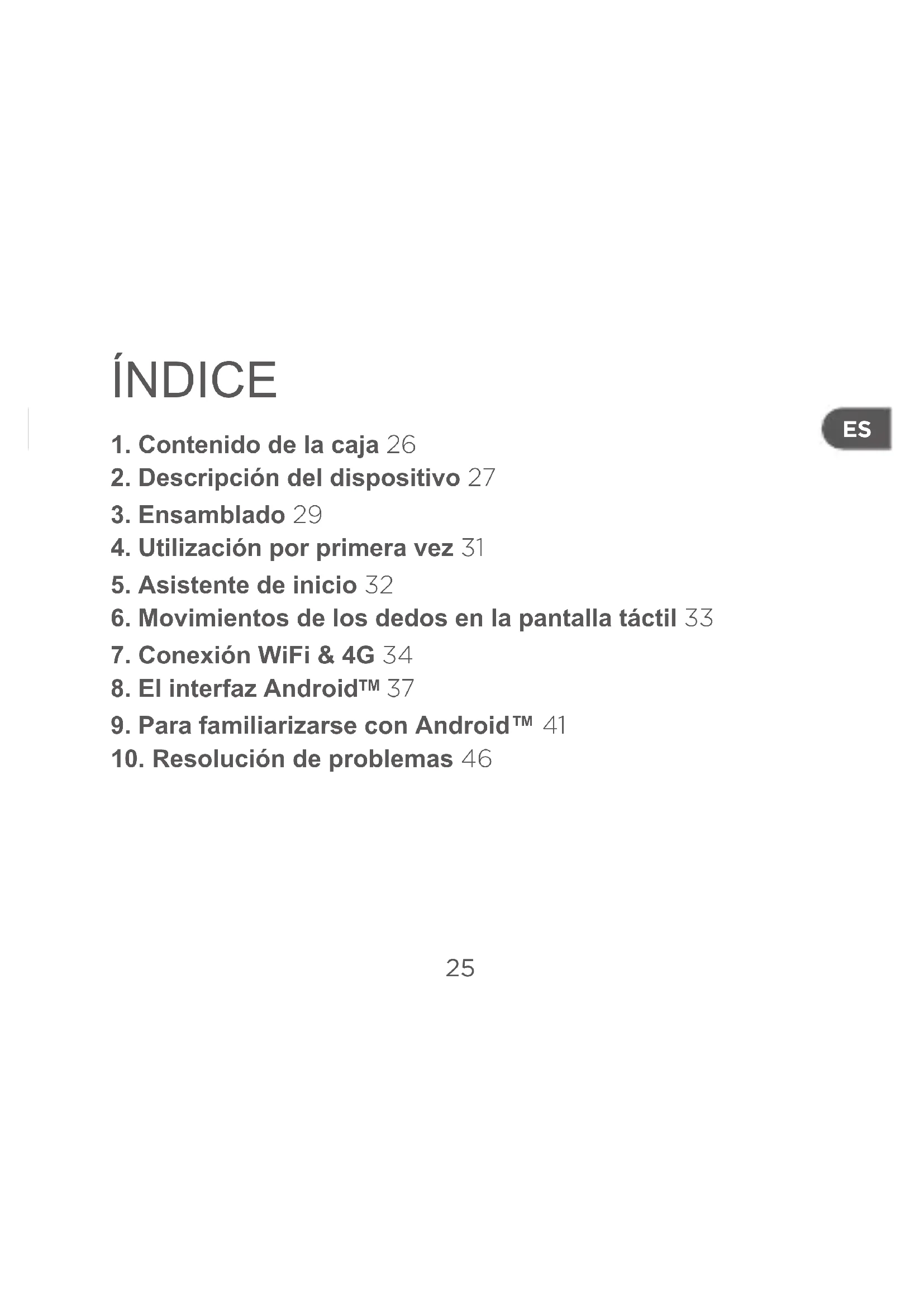 La primera vez que encienda el teléfono, el asistente de instalación le ayudará a congurar el dispositivo : - Idioma - Fecha y hora - Conexión WiFi - El servicio de ubicación - Aplicaciones de terceras partes CONSEJOS: El dispositivo desactiva la pantalla táctil tras un determinado periodo sin utilizar. Para volver a activar la pantalla, pulse el botón ON/OFF. ES33