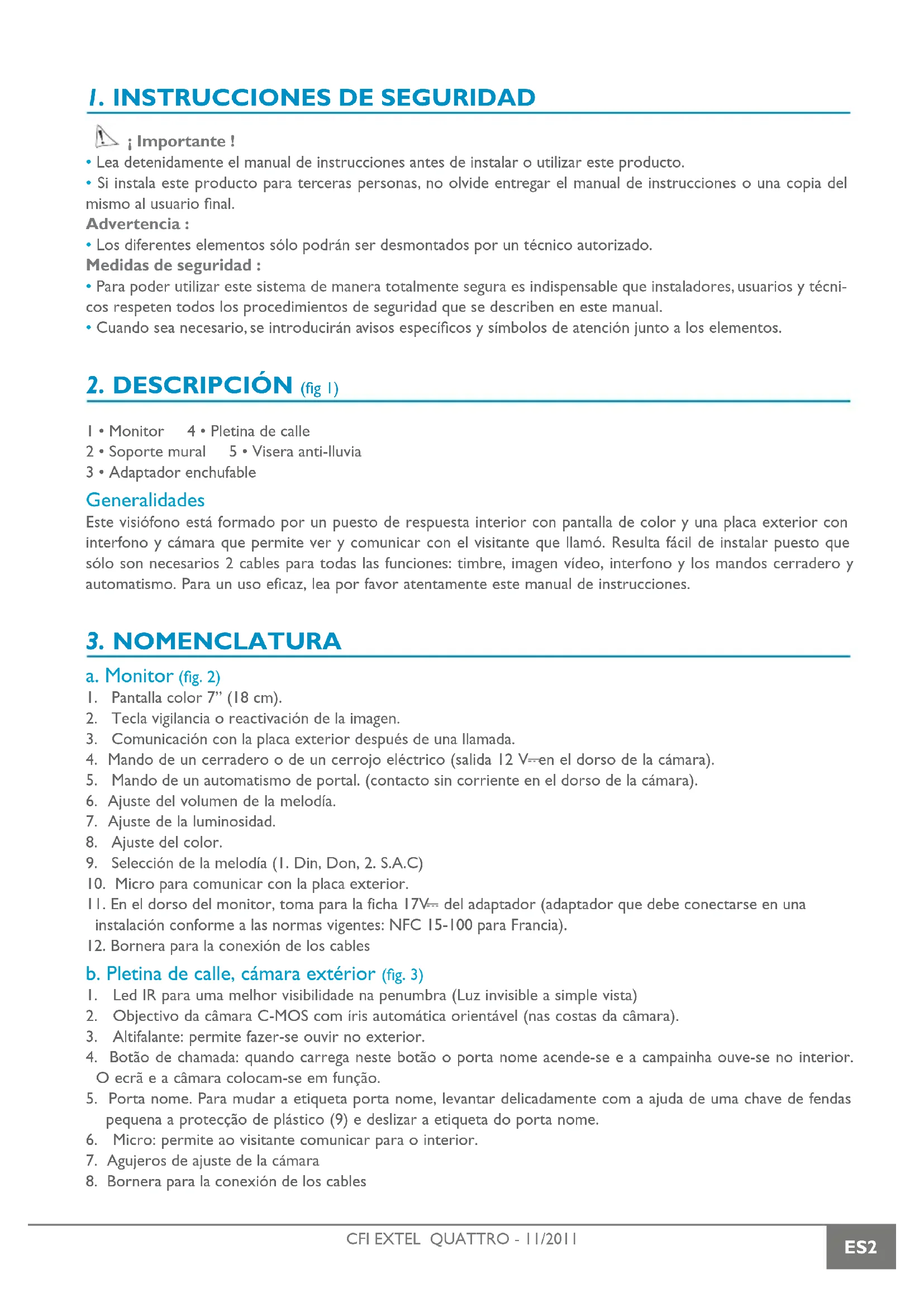 Los daños ocasionados por no respetar el manual de instrucciones conducirán a la anulación de la garantía. EXTEL no se responsabilizará de los daños que resulten de esta falta de conformidad. Tampoco se responsabilizará de los daños que puedan sufrir los bienes o las personas por la incorrecta manipulación del sistema o el incumplimiento de las instrucciones de seguridad. Este producto se ha fabricado en el más absoluto respeto de las instrucciones de seguridad. Para garantizar este estado y optimizar la utilización del producto, el usuario debe respetar las instrucciones y advertencias de seguridad contenidas en este manual. El usuario de este sistema tendrá que responsabilizarse de este último y deberá comprobar que la videovigilancia está permitida por la ley vigente en el país de utilización. : Este símbolo indica un riesgo de choque eléctrico o un riesgo de cortocircuito. Sólo podrá utilizar este producto con una tensión comprendida entre: 100 240 voltios y 50 60 hertzios. Nunca intente utilizar este aparato con una tensión diferente. - Compruebe que todas las conexiones eléctricas del sistema sean conformes a las instrucciones de uso. - Si este sistema se instala en establecimientos comerciales, habrá que respetar las normas de prevención de accidentes para las instalaciones eléctricas. - Si se instala en establecimientos escolares, talleres, etc., será necesaria la presencia de personal cualificado para controlar el funcionamiento de los aparatos electrónicos. - Respete las instrucciones de uso de los demás aparatos conectados al sistema (vídeo, TV, PC por ejemplo). - En caso de tener dudas sobre el modo de funcionamiento o la seguridad de los aparatos, póngase en contacto con una persona cualificada. - Nunca enchufe o desenchufe los aparatos eléctricos con las manos mojadas. - Cuando instale este producto, compruebe que los cables de alimentación no corren el riesgo de ser dañados. - ¡Nunca cambie los cables eléctricos dañados usted mismo! En tal caso, sáquelos y recurra a una persona cualificada para que los sustituya. ATENCIÓN Avisa al usuario de la presencia de instrucciones importantes relativas al mantenimiento (la reparación) en la documentación que acompaña al aparato. Avisa al usuario de la presencia de “tensiones peligrosas” no aisladas dentro de la caja del producto y suficientemente importantes como para representar un riesgo de electrocución para las personasCFI EXTEL QUATTRO - 11/2011 PT1 SUMÁRIO 1 INSTRUÇÕES DE SEGURANÇA.. .....................................p.2 2 DESCRITIVO. .....................................................................................p.2 3 NOMENCLATURA ........................................................................ p.2 a. Monitor b. Placa de rua, câmara exterior