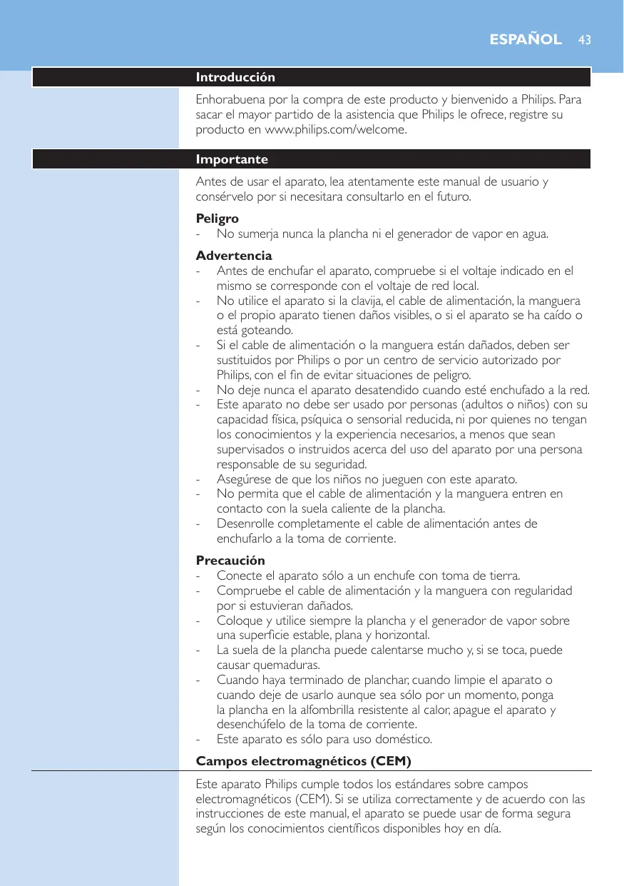 Introducción Enhorabuena por la compra de este producto y bienvenido a Philips. Para sacar el mayor partido de la asistencia que Philips le ofrece, registre su producto en www.philips.com/welcome. Importante Antes de usar el aparato, lea atentamente este manual de usuario y consérvelo por si necesitara consultarlo en el futuro. Peligro - No sumerja nunca la plancha ni el generador de vapor en agua. Advertencia - Antes de enchufar el aparato, compruebe si el voltaje indicado en el mismo se corresponde con el voltaje de red local. - No utilice el aparato si la clavija, el cable de alimentación, la manguera o el propio aparato tienen daños visibles, o si el aparato se ha caído o está goteando. - Si el cable de alimentación o la manguera están dañados, deben ser sustituidos por Philips o por un centro de servicio autorizado por Philips, con el fin de evitar situaciones de peligro. - No deje nunca el aparato desatendido cuando esté enchufado a la red. - Este aparato no debe ser usado por personas (adultos o niños) con su capacidad física, psíquica o sensorial reducida, ni por quienes no tengan los conocimientos y la experiencia necesarios, a menos que sean supervisados o instruidos acerca del uso del aparato por una persona responsable de su seguridad. - Asegúrese de que los niños no jueguen con este aparato. - No permita que el cable de alimentación y la manguera entren en contacto con la suela caliente de la plancha. - Desenrolle completamente el cable de alimentación antes de enchufarlo a la toma de corriente. Precaución - Conecte el aparato sólo a un enchufe con toma de tierra. - Compruebe el cable de alimentación y la manguera con regularidad por si estuvieran dañados. - Coloque y utilice siempre la plancha y el generador de vapor sobre una superficie estable, plana y horizontal. - La suela de la plancha puede calentarse mucho y, si se toca, puede causar quemaduras. - Cuando haya terminado de planchar, cuando limpie el aparato o cuando deje de usarlo aunque sea sólo por un momento, ponga la plancha en la alfombrilla resistente al calor, apague el aparato y desenchúfelo de la toma de corriente. - Este aparato es sólo para uso doméstico. Campos electromagnéticos (CEM) Este aparato Philips cumple todos los estándares sobre campos electromagnéticos (CEM). Si se utiliza correctamente y de acuerdo con las instrucciones de este manual, el aparato se puede usar de forma segura según los conocimientos científicos disponibles hoy en día.