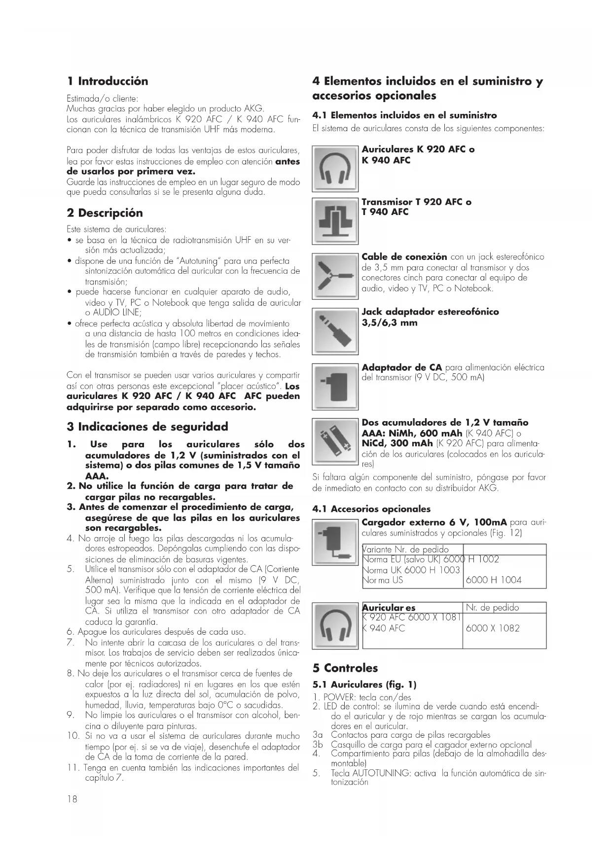 Problema Non c’è segnale Il LED di controllo per la funzione di carica non si accende Riproduzione in mono Fruscìo forte Suono distorto18 1 Introducción Estimada/o cliente: Muchas gracias por haber elegido un producto AKG. Los auriculares inalámbricos K 920 AFC / K 940 AFC fun- cionan con la técnica de transmisión UHF más moderna. Para poder disfrutar de todas las ventajas de estos auriculares, lea por favor estas instrucciones de empleo con atención antes de usarlos por primera vez. Guarde las instrucciones de empleo en un lugar seguro de modo que pueda consultarlas si se le presenta alguna duda. 2 Descripción Este sistema de auriculares: