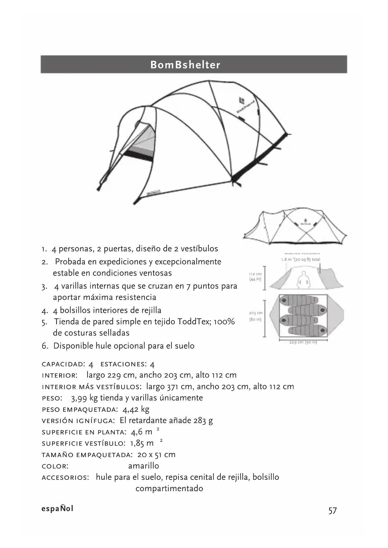 (20 sq ft) total1. 2 personas, 4 varillas, diseñada para pendientes y con vestíbulo opcional
