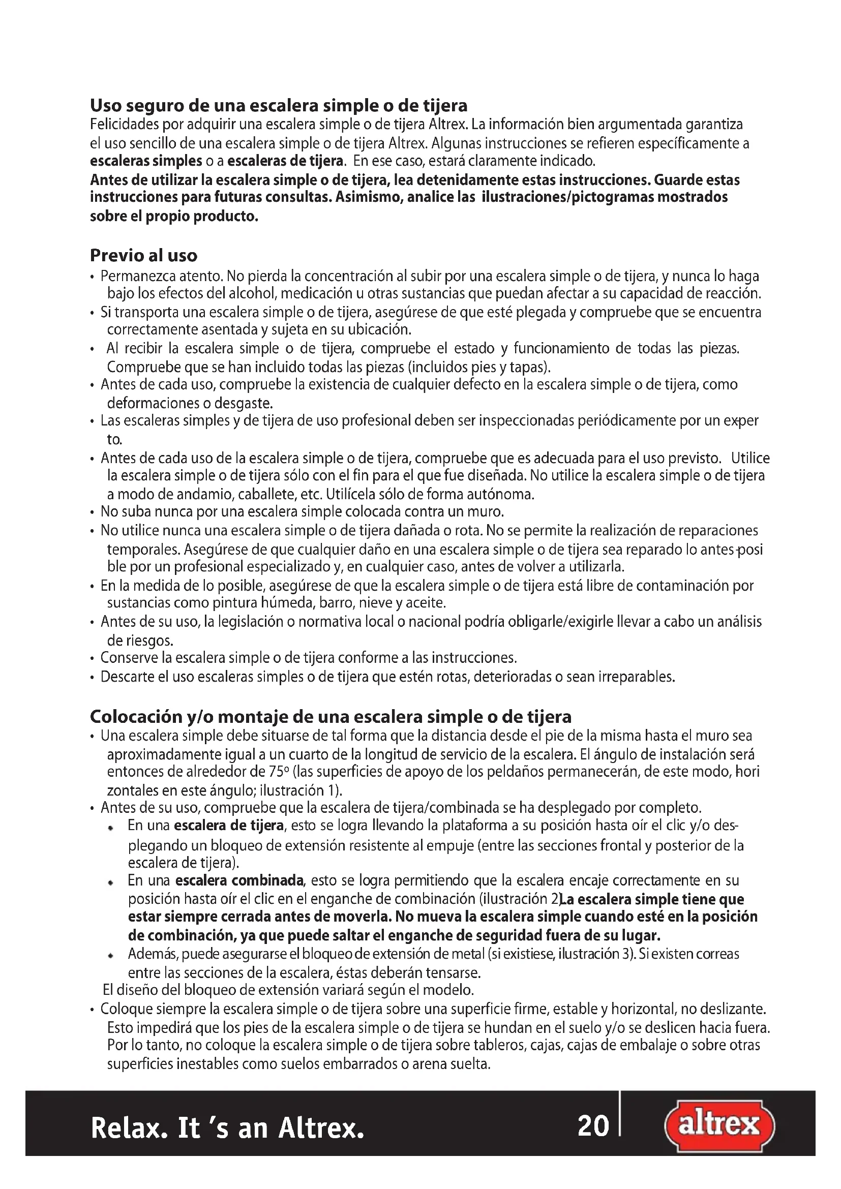 - No utilice nunca una escalera simple al revés o invertida. La posición de la escalera simple será evidente Relax. It ’s an Altrex. 22 23debido a la posición horizontal que deben tener las superficies de apoyo de los peldaños.