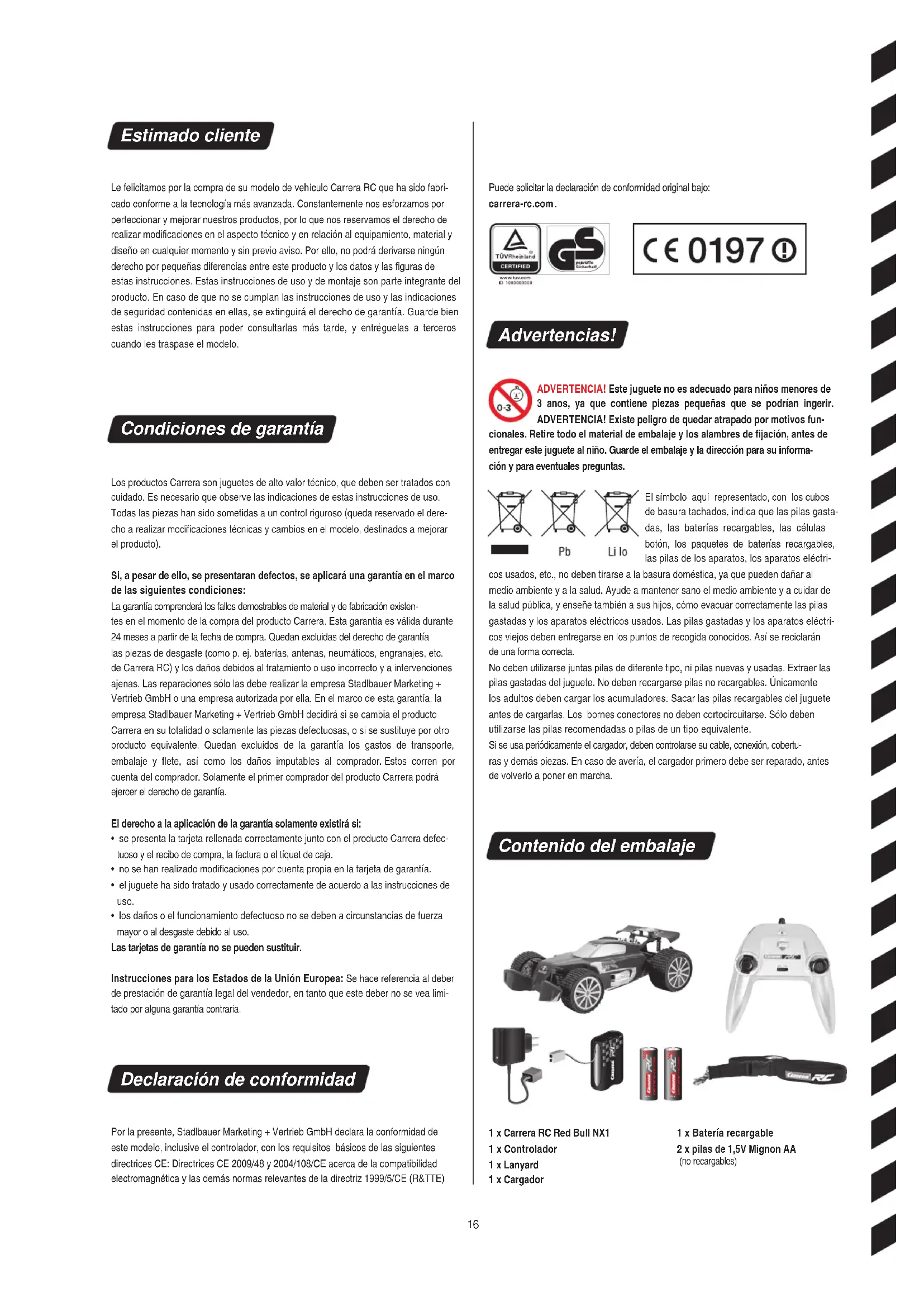 Advertencias! ADVERTENCIA! Este juguete no es adecuado para niños menores de 3 anos, ya que contiene piezas pequeñas que se podrían ingerir. ADVERTENCIA! Existe peligro de quedar atrapado por motivos fun- cionales. Retire todo el material de embalaje y los alambres de fijación, antes de entregar este juguete al niño. Guarde el embalaje y la dirección para su informa- ción y para eventuales preguntas. El símbolo aquí representado, con los cubos de basura tachados, indica que las pilas gasta- das, las baterías recargables, las células botón, los paquetes de baterías recargables, las pilas de los aparatos, los aparatos eléctri- cos usados, etc., no deben tirarse a la basura doméstica, ya que pueden dañar al medio ambiente y a la salud. Ayude a mantener sano el medio ambiente y a cuidar de la salud pública, y enseñe también a sus hijos, cómo evacuar correctamente las pilas gastadas y los aparatos eléctricos usados. Las pilas gastadas y los aparatos eléctri- cos viejos deben entregarse en los puntos de recogida conocidos. Así se reciclarán de una forma correcta. No deben utilizarse juntas pilas de diferente tipo, ni pilas nuevas y usadas. Extraer las pilas gastadas del juguete. No deben recargarse pilas no recargables. Únicamente los adultos deben cargar los acumuladores. Sacar las pilas recargables del juguete antes de cargarlas. Los bornes conectores no deben cortocircuitarse. Sólo deben utilizarse las pilas recomendadas o pilas de un tipo equivalente. Si se usa periódicamente el cargador, deben controlarse su cable, conexión, cobertu- ras y demás piezas. En caso de avería, el cargador primero debe ser reparado, antes de volverlo a poner en marcha. Contenido del embalaje 1 x Carrera RC Red Bull NX1 1 x Controlador 1 x Lanyard 1 x Cargador 1 x Batería recargable 2 x pilas de 1,5V Mignon AA (no recargables)1