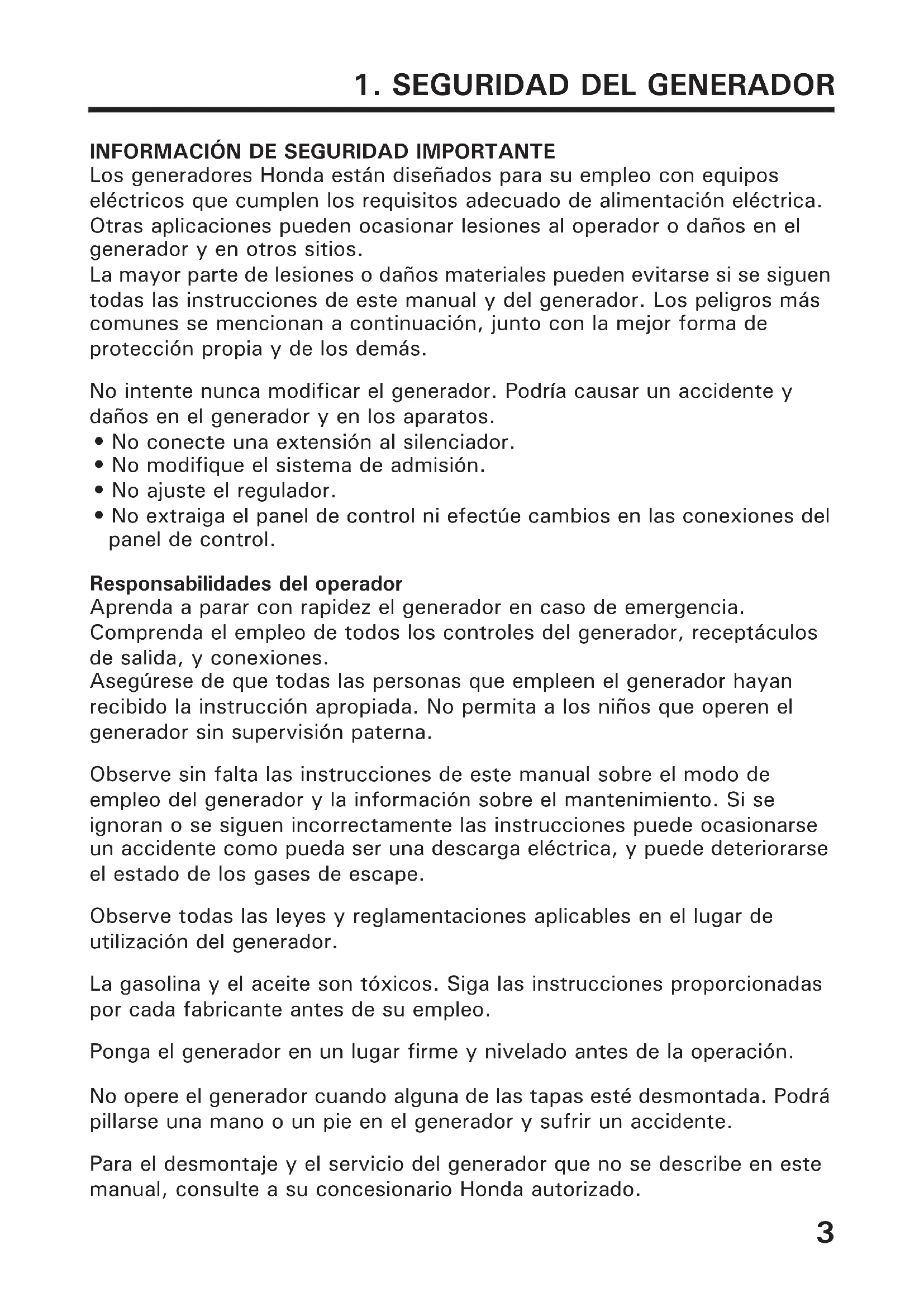 - No extraiga el panel de control ni efectúe cambios en las conexiones del panel de control. Responsabilidades del operador Aprenda a parar con rapidez el generador en caso de emergencia. Comprenda el empleo de todos los controles del generador, receptáculos de salida, y conexiones. Asegúrese de que todas las personas que empleen el generador hayan recibido la instrucción apropiada. No permita a los niños que operen el generador sin supervisión paterna. Observe sin falta las instrucciones de este manual sobre el modo de empleo del generador y la información sobre el mantenimiento. Si se ignoran o se siguen incorrectamente las instrucciones puede ocasionarse un accidente como pueda ser una descarga eléctrica, y puede deteriorarse el estado de los gases de escape. Observe todas las leyes y reglamentaciones aplicables en el lugar de utilización del generador. La gasolina y el aceite son tóxicos. Siga las instrucciones proporcionadas por cada fabricante antes de su empleo. Ponga el generador en un lugar firme y nivelado antes de la operación. No opere el generador cuando alguna de las tapas esté desmontada. Podrá pillarse una mano o un pie en el generador y sufrir un accidente. Para el desmontaje y el servicio del generador que no se describe en este manual, consulte a su concesionario Honda autorizado.