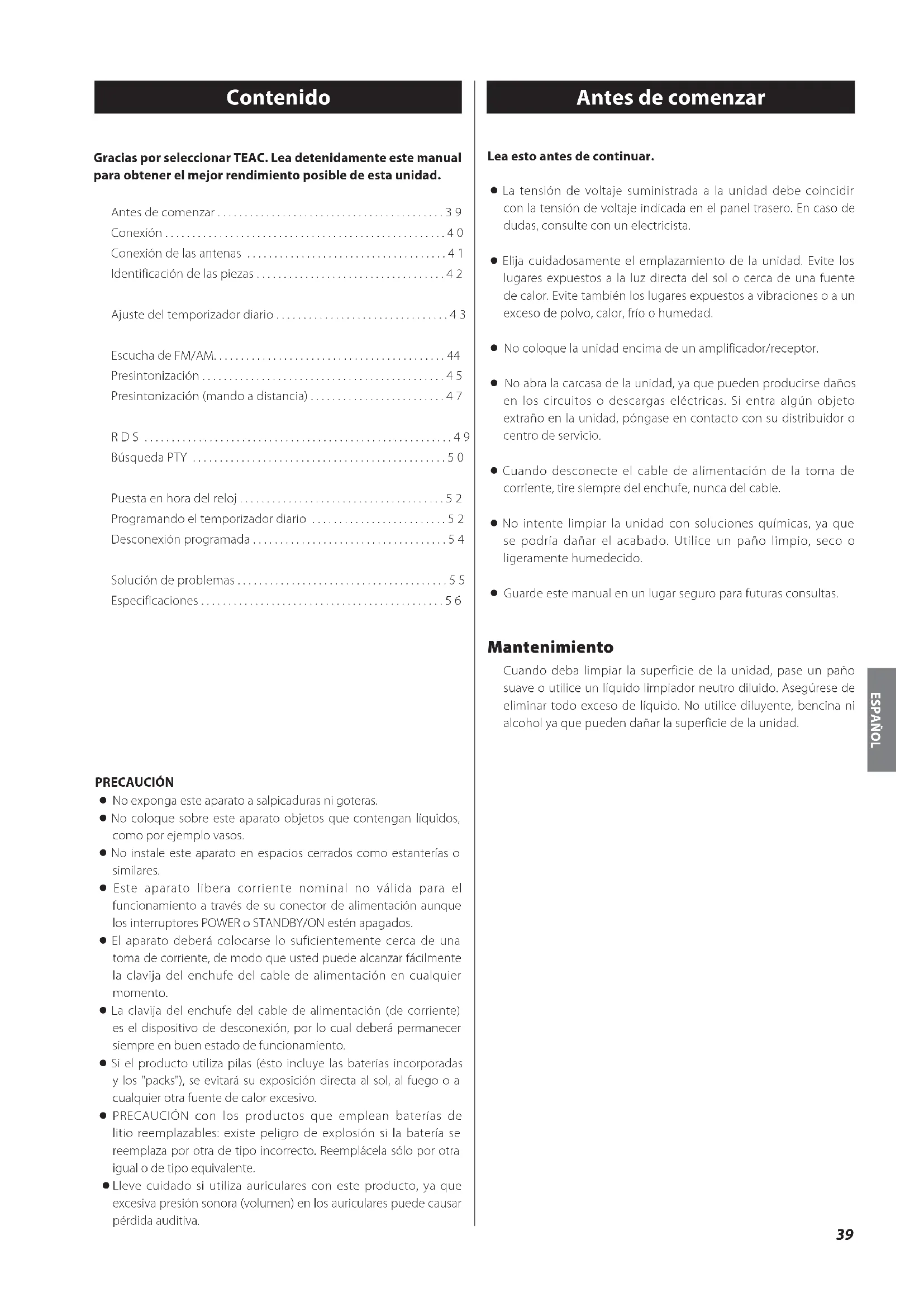 SL:90 (80, 70, 60, 50, 40, 30, 20 ó 10) La unidad se apagará cuando transcurran 90 (80, 70, 60, 50, 40, 30, 20 ó 10) minutos, respectivamente. Pantalla normal Desactivado el temporizador de desconexión automática. < Si quiere saber el tiempo que falta para la desconexión, pulse una vez el botón SLEEP. El tiempo restante se visualizará durante 2,5 segundos, y se restablecerá la pantalla normal. Programando el temporizador diario 255 ESPAÑOL Solución de problemas Si surge algún problema con la unidad y antes de ponerse en contacto con su distribuidor o centro de servicio TEAC, consulte la siguiente tabla y considere si usted mismo puede resolver el problema. No hay corriente. e Compruebe la conexión a la red. Compruebe que la fuente de corriente no es una toma con interruptor y que, si lo es, el interruptor no está activado. Compruebe que hay corriente en la toma de corriente conectando otro aparato como una lámpara o un ventilador. No hay sonido e Compruebe la conexión al amplificador. e Compruebe que el amplificador funciona correctamente. No puede recibirse ninguna emisora, o la señal es demasiado débil. e Compruebe que la antena está conectada correctamente. e Sintonice bien la emisora. e Instale de nuevo la antena, colocándola en una mejor posición de recepción. e Puede que sea necesaria una antena externa. Sonido con ruido. e Aleje la antena lo máximo posible del televisor o reproductor de CD. e Si hay un televisor o reproductor de CD cerca de la unidad, apáguelos. Aunque la emisión es en estéreo, se recibe en mono. e Pulse el botón FM MODE. Si no se restablece el funcionamiento normal, desconecte el cable de corriente de la toma eléctrica y vuélvalo a conectar. Para devolver a su unidad los ajustes predeterminados de fábrica Si su unidad no está funcionando correctamente, se aconseja reinicializarla a los ajustes predeterminados de fábrica. Esto eliminará las configuraciones (incluyendo las contraseñas) y otros ajustes de usuario (presintonías, etc.). Mantenga pulsados el botón TIMER y el botón BAND durante unos segundos. El T-R650 tendrá ahora los ajustes por defecto que vienen de fábrica.56 Especificaciones Sintonizador de FM Rango de sintonización ....87,50 a 108,00 MHz (en pasos de 50 kHz) Sensibilidad útil ...........................................6 dBμ Distorsión armónica ................................0,8 % (Mono) 1,2 % (Estéreo) Relación señal/ruido ...............................70 dB (Mono) 65 dB (Estéreo) Separación estereofónica ...........................35 dB (1 kHz) Emisoras memorizadas ........................................30 Sintonizador de AM Rango de sintonización ......522 a 1, 629 kHz (en pasos de 9 kHz) Sensibilidad útil ..........................................55 dBμ Distorsión armónica .............................1,5 % (a 74 dBμ) Relación señal/ruido ............................45 dB (a 80 dBμ) Emisoras memorizadas ........................................30 General Requisitos de corriente .........................CA 230 V , 50 Hz Consumo eléctrico .......................9 W (en espera: 0,5 W) Dimensiones (An x Al x Pr) ................... 435 x 85 x 295 mm Peso ......................................................3,2kg Temperatura de funcionamiento ...................+5˚C - +35˚C Humedad de funcionamiento ...... 5% a 85% (sin condensación) Temperatura de almacenamiento .................–20˚C - +55˚C Accesorios Antena de cuadro de AM x 1 Antena de FM monocable x 1 Cable de conexión de control remoto del sistema x 1 Cable RCA estéreo x 1 Manual del usuario (este documento) x 1 Tarjeta de garantía < El diseño y las especificaciones se encuentran sujetos a cambios sin previo aviso. < Las dimensiones y pesos son aproximados. < Las ilustraciones pueden diferir ligeramente de los modelos de producción. Información para consumidores sobre recogida y eliminación de equipos viejos y pilas usadas Estos símbolos en los productos, embalajes y/o documentos que los acompañan significan que los productos eléctricos y electrónicos y las pilas no deben mezclarse con la basura doméstica. Para que los productos viejos y las pilas usadas reciban un tratamiento de recuperación y reciclaje adecuado, por favor llévelos a los puntos de recogida pertinentes, de acuerdo con la legislación de su país y de las Directivas Europeas 2002/96/EC y 2006/66/EC. Deshaciéndose correctamente de estos productos y de las pilas, usted contribuye a conservar recursos valiosos y a prevenir cualquier efecto negativo potencial sobre la salud humana y el medioambiente que podrían derivarse de una gestión incorrecta de estos residuos. Para más información sobre la recogida y el reciclaje de productos viejos y pilas usadas, por favor contacte con su ayuntamiento, con el servicio local de recogida de basuras o con el punto de venta donde los adquirió. Información sobre cómo deshacerse de estos productos en otros países fuera de la Unión Europea Estos símbolos solamente son válidos en la Unión Europea. Si desea deshacerse de estos productos, por favor contacte con las autoridades locales o con su distribuidor e infórmese del método adecuado para ello. Nota para el símbolo de las pilas (los 2 ejemplos de símbolos abajo a la derecha): Este símbolo podría utilizarse junto a un símbolo químico. En tal caso cumple con lo dispuesto por la Directiva para cuando hay elementos químicos involucrados. Para consumidores europeos57 DEUTSCH
